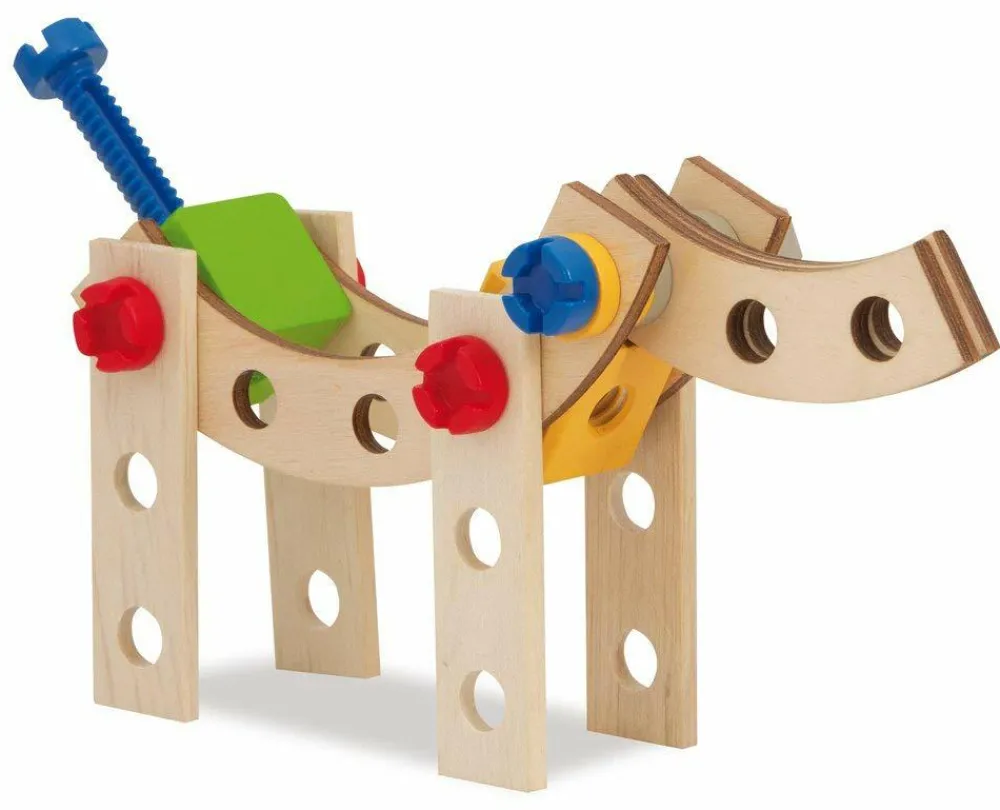 En kæmpe spand med masser af træelementer, skruer og møtrikker, som vil få det til at klø i de små fingre og sætte fantasien i gang.