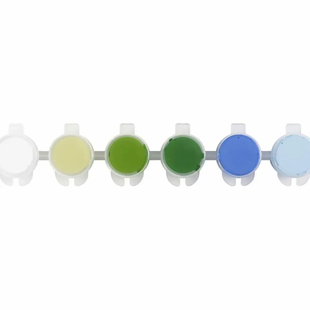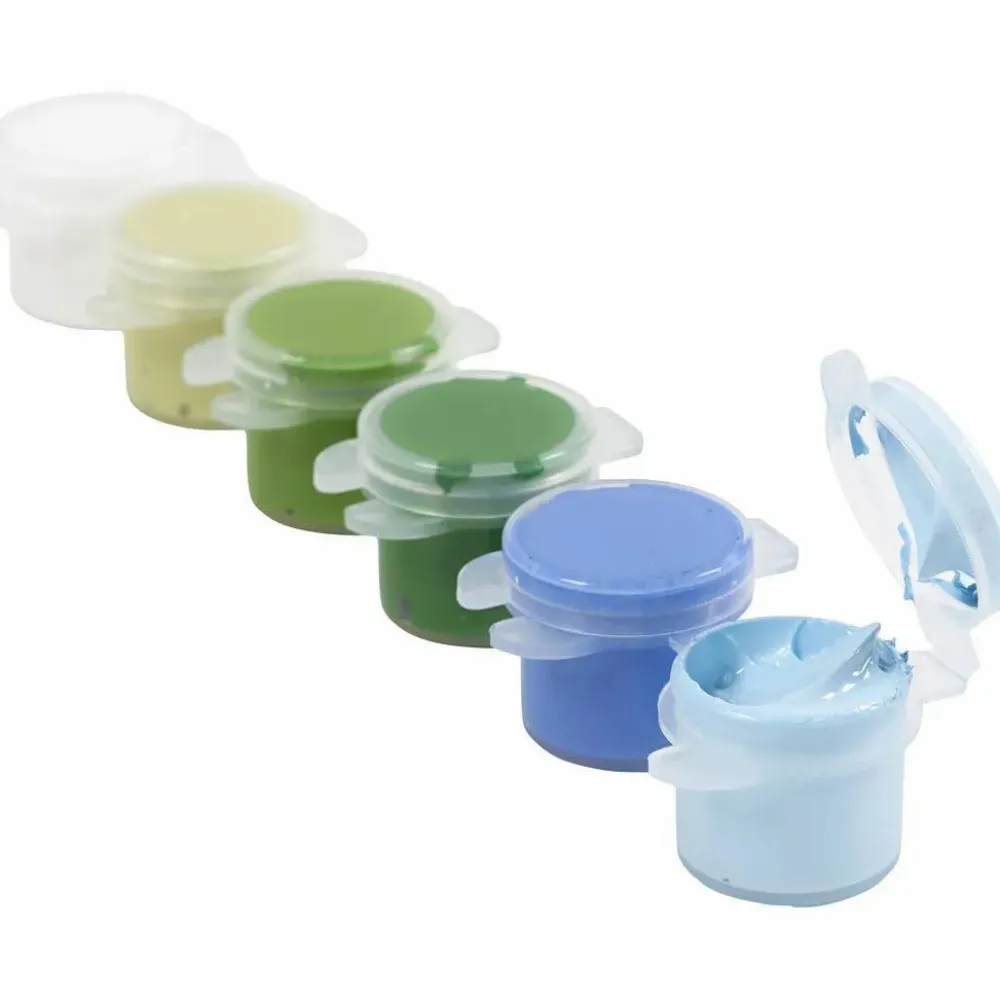 Her er 6 små bøtter med akrylmaling i blå-grønne nuancer.