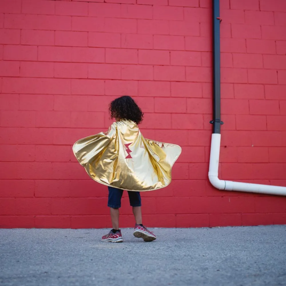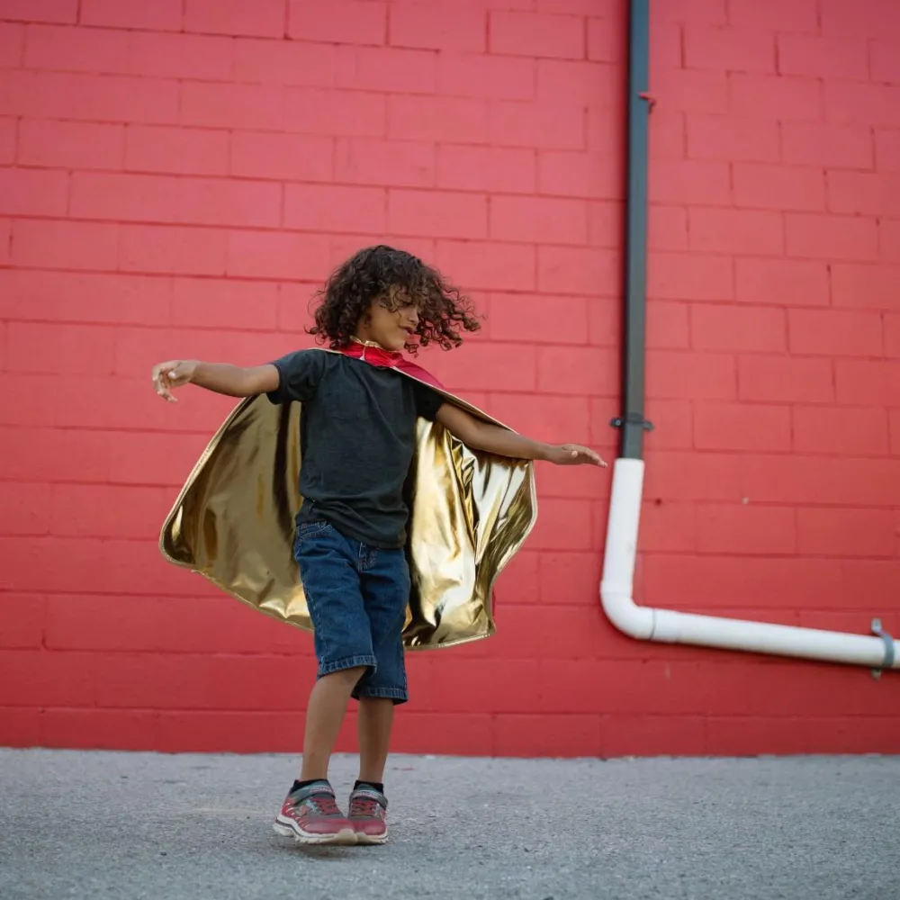 Denne smarte udklædningskappe er vendbar, så dit barn selv kan vælge, om den røde side eller siden med guldfarve skal vende udad.