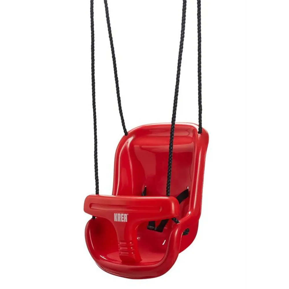 Gyngen her er udført i stødfast plast og monteret med en sele, for at sikre dit barn under gyngeturen.