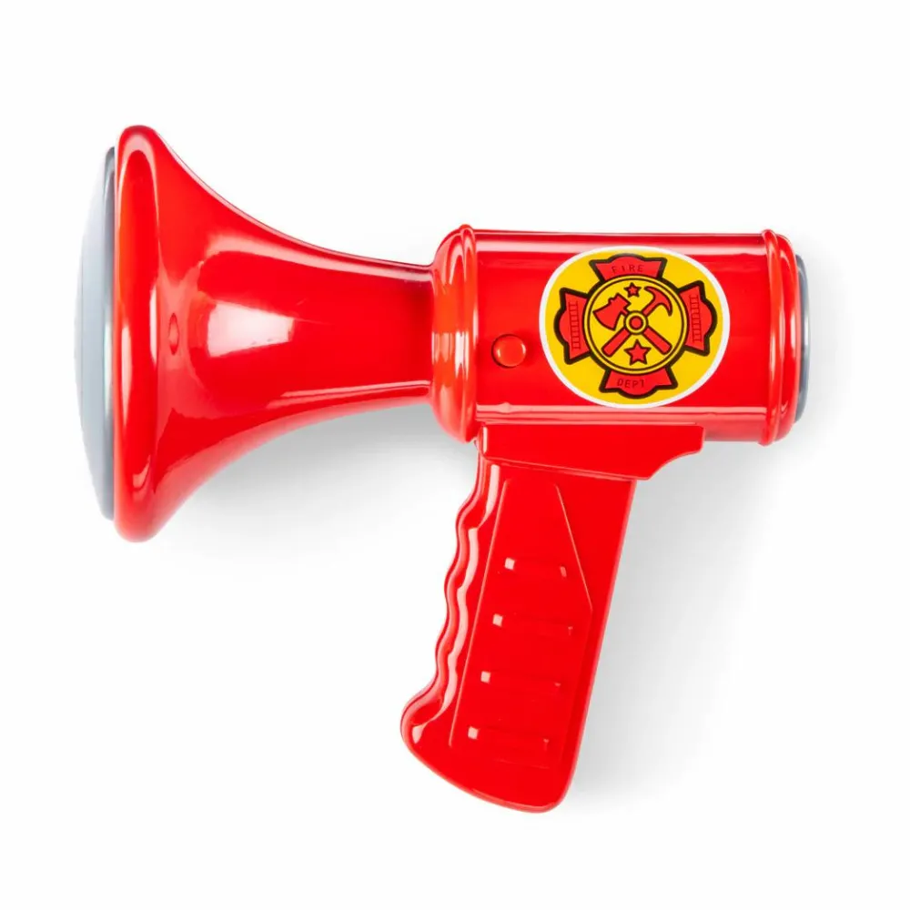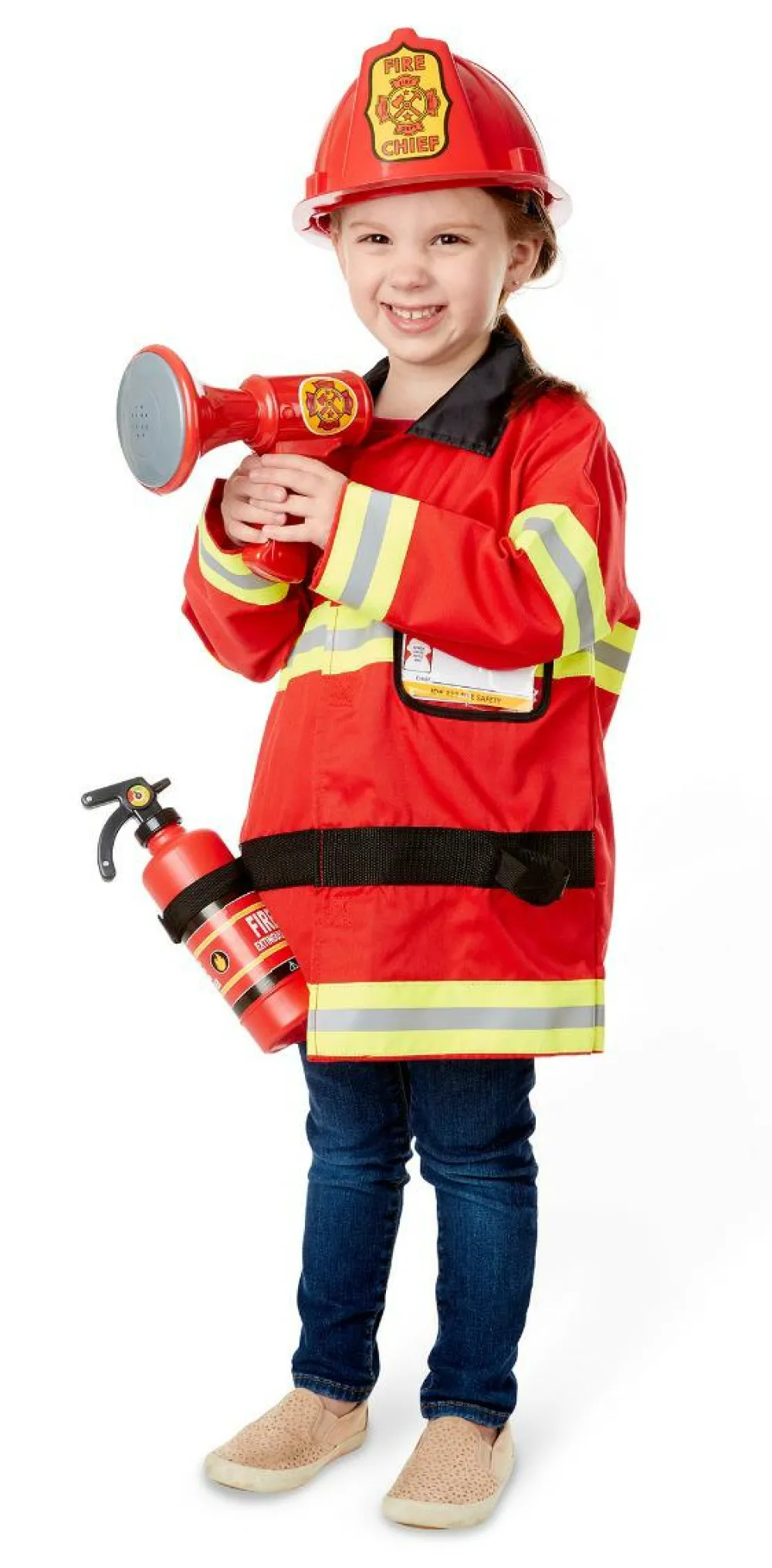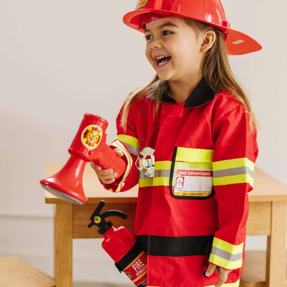 En brandchefs hjelm, en brandslukker (rekvisit) en megafon med lydeffekter, et badgeskilt og et navneskilt.
