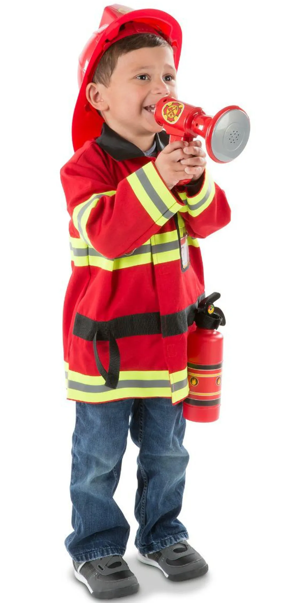 Med dette sæt er der alt, hvad I behøver for at jeres søn eller datter kan blive klædt ud som en rigtig brandmand. En klar rød brandmandsjakke – naturligvis udstyret med reflekser.