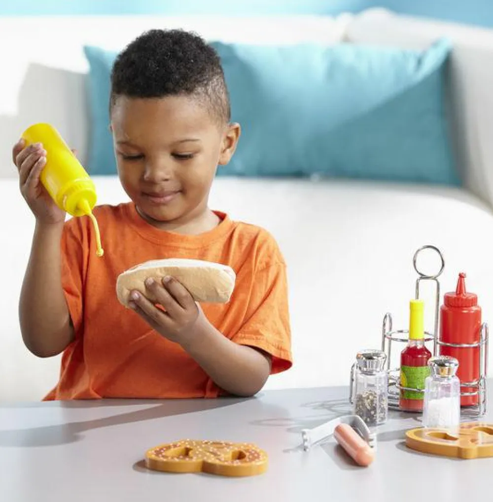 Skønne tilføjelser til legekøkkenet til det madglade barn. Ketchup, sennep, chilisauce, salt og peber. Det bedste er, at flaskernes indhold rigtigt “sprøjter” – det er godt nok snor, men det ligner. Lydene og udseendet er helt perfekt.