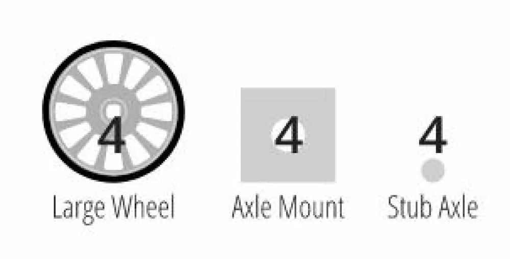 Indeholder 4 hjul og dæk og 4 aksler med tilbehør. I alt bliver det til 12 dele.