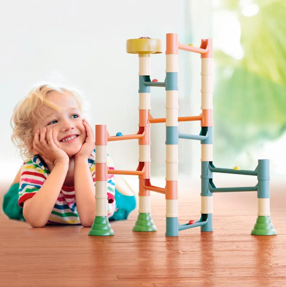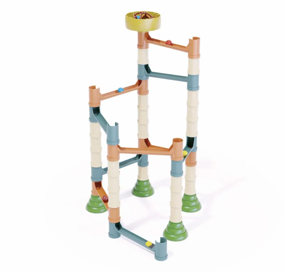 Efterlign kuglebanen på æsken eller find på jeres egne konstruktioner og lad kuglerne trille over broer og ned gennem rør.