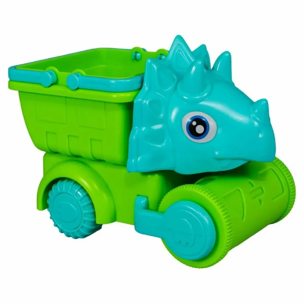 Sejt sæt, hvor skovl, en rulle til at lave mønstre i sandet og den firkantede spand kan sættes sammen og blive til en dinosaur-bil, som kan ræse rundt i sandet eller langs kanten af sandkassen. Det hele kommer i et net.