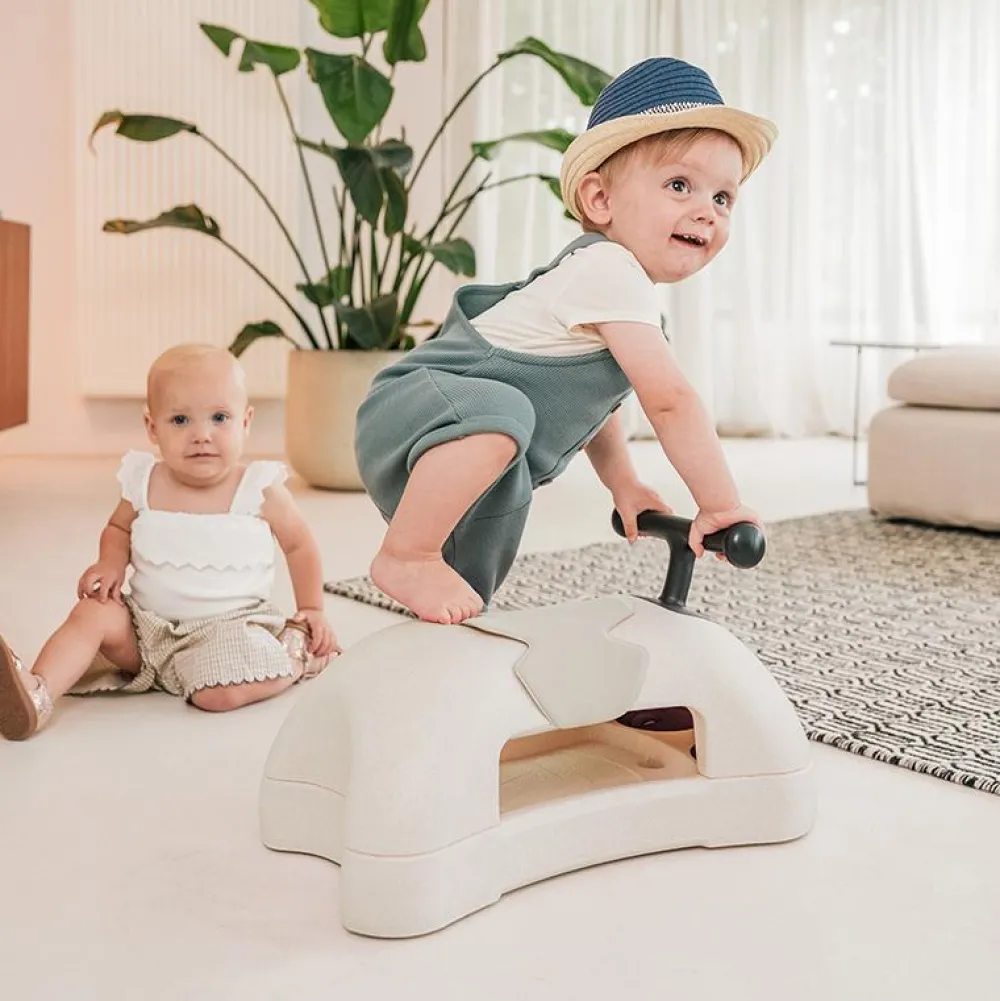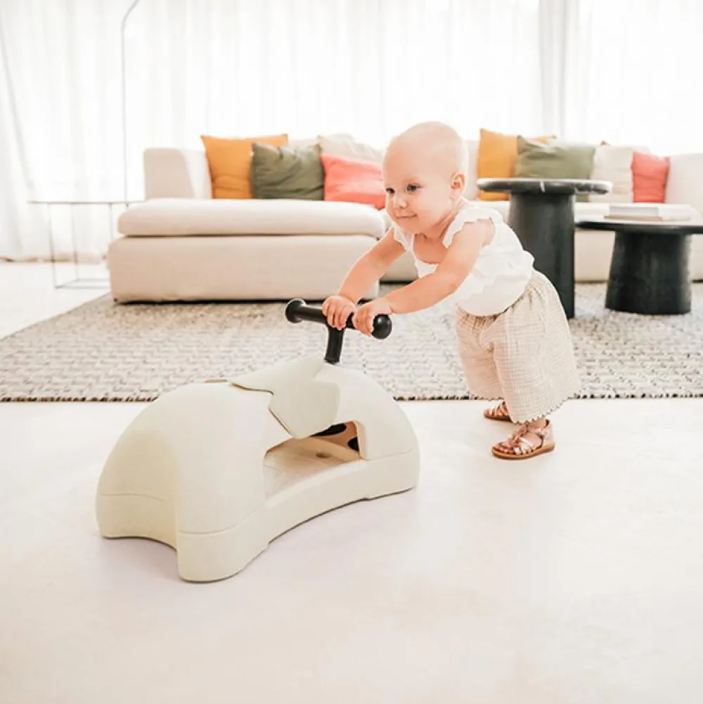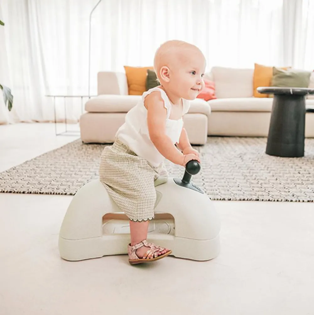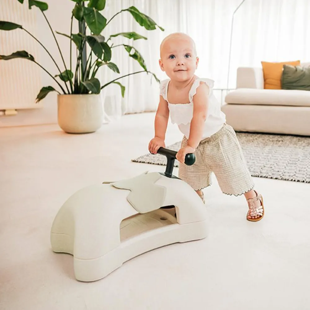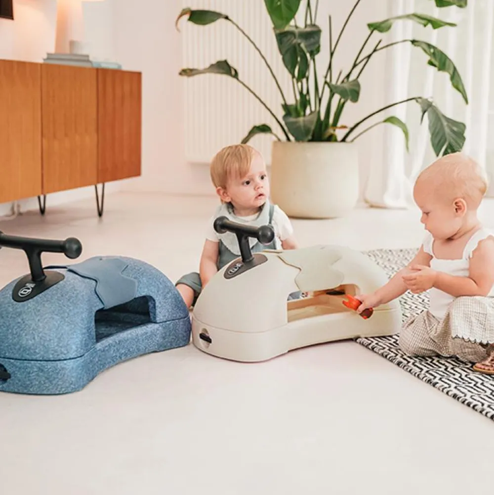 Køretøjet er stilrent, og så kan det både bruges som gåbil, som scooter og som motorikbræt, som dit barn kan ligge på maven eller sidde på numsen og skubbe fremad med hænder og fødder.