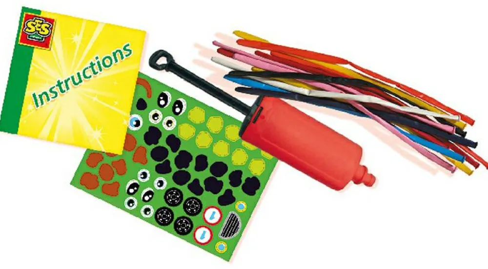 Her er masser af sjove balloner, en håndpumpe til at puste dem op med, og klistermærker til at lave ansigter på de færdige ballondyr.