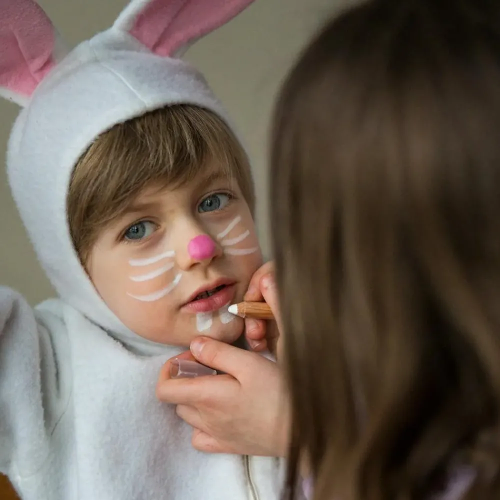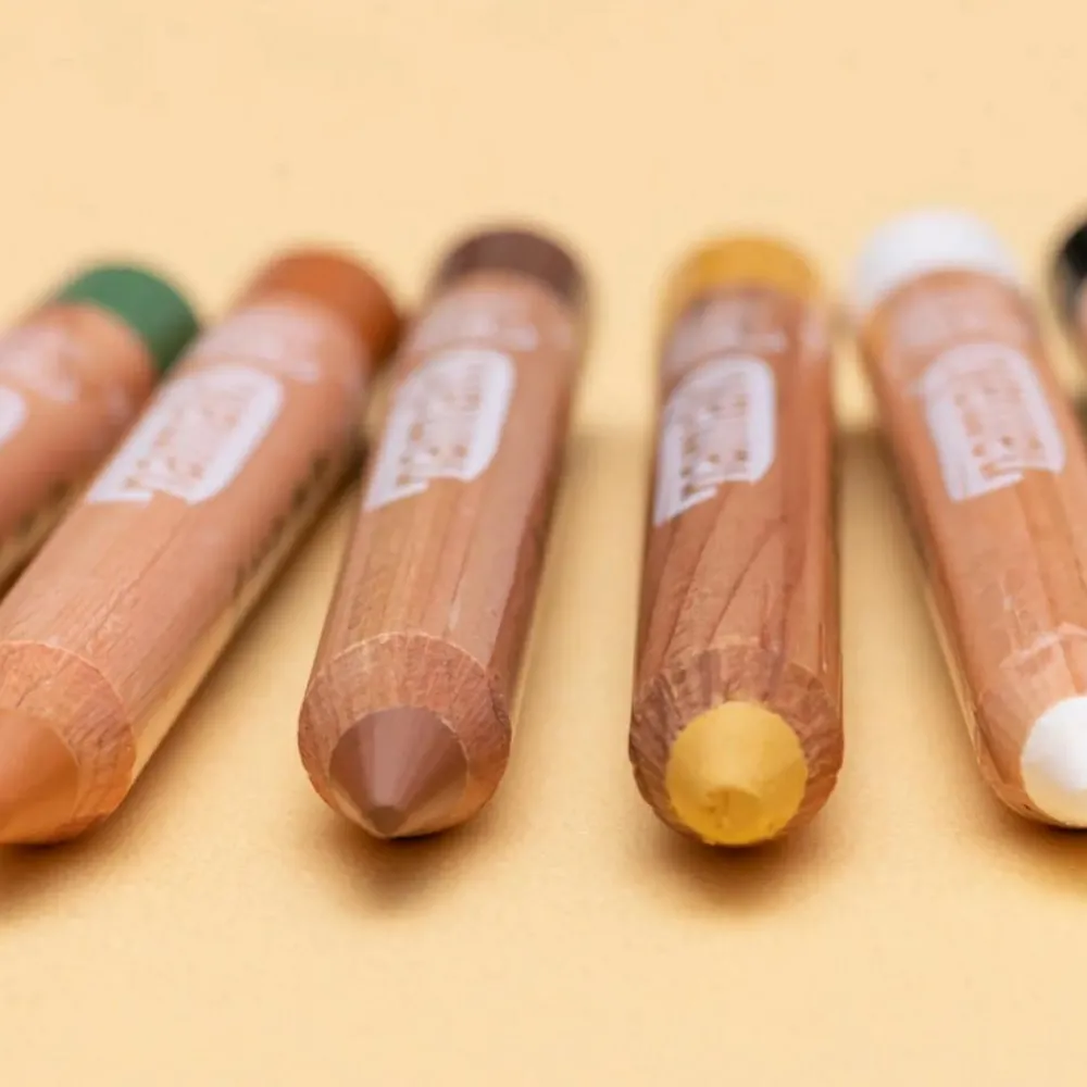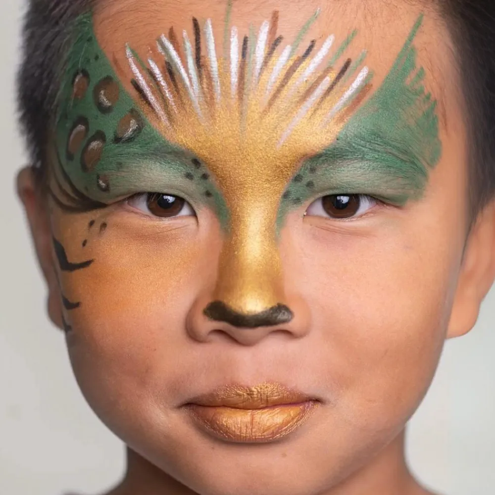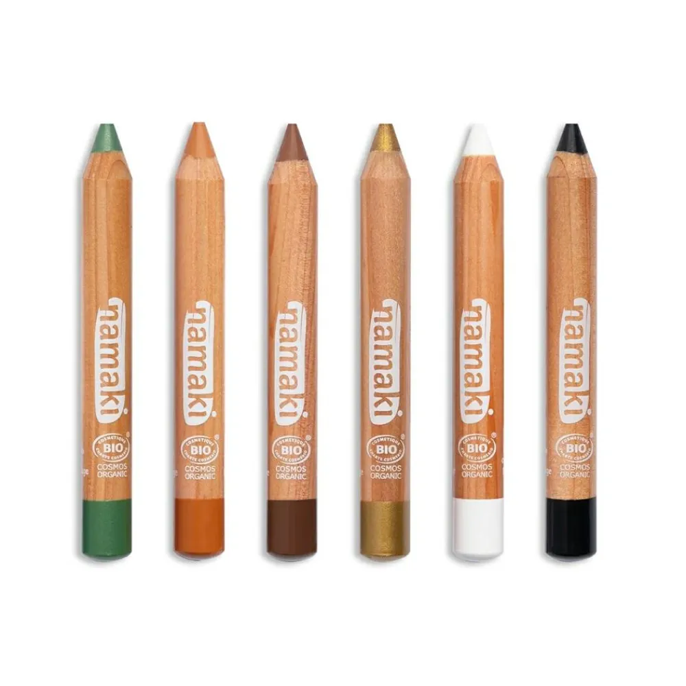 Sæt med sminkeblyanter i grøn, orange, brun og guld, sort og hvid, så du kan sminke et flot jungledyr, en løve eller sommerfugl eller hvad dit barn nu ønsker sig – eller du kan i hvert fald gøre dit bedste.