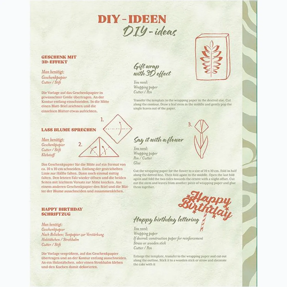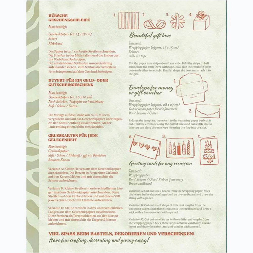 Her er 10 ark på 50 x 70 cm tykt og lækkert designet gavepapir med fine tryk samlet i en bog med tilhørende til-og-fra-mærker.