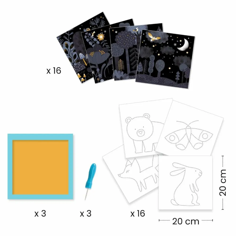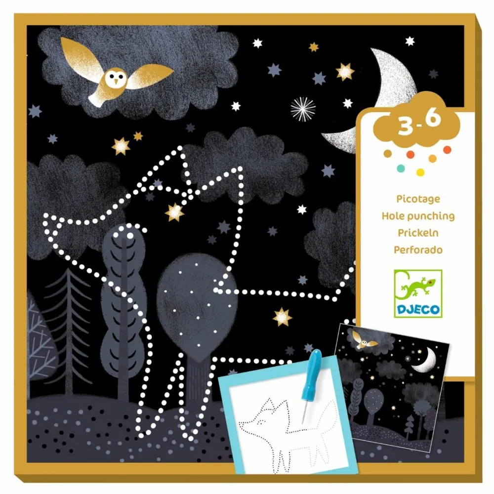 Nu kommer det sjove med at prikke med nålen i alle prikkerne, så prikmotivet bagefter kan ses på nattebaggrunden.