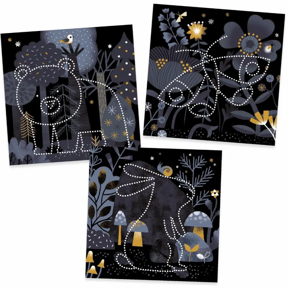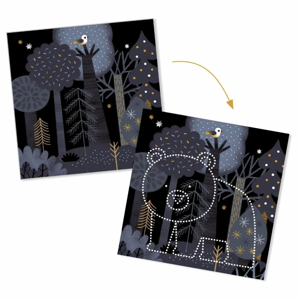 Vælg en af baggrundene med nattemotiver og sæt den i rammen. Tag derefter et af de hvide ark med med prikmotiver og læg hen over nattebilledet.