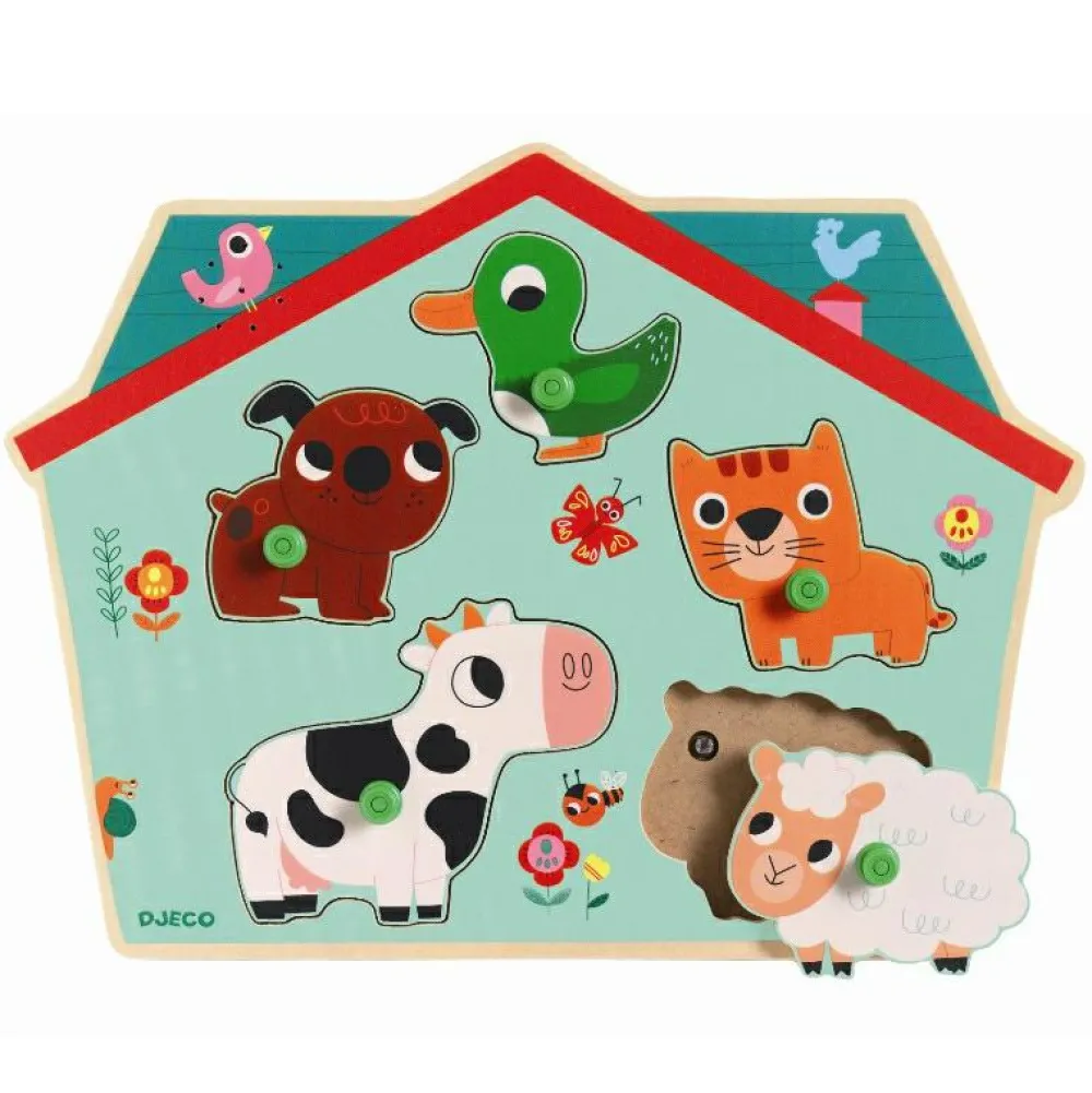 Fint puslespil med 5 dyr, der giver lyd, når I flytter brikken.