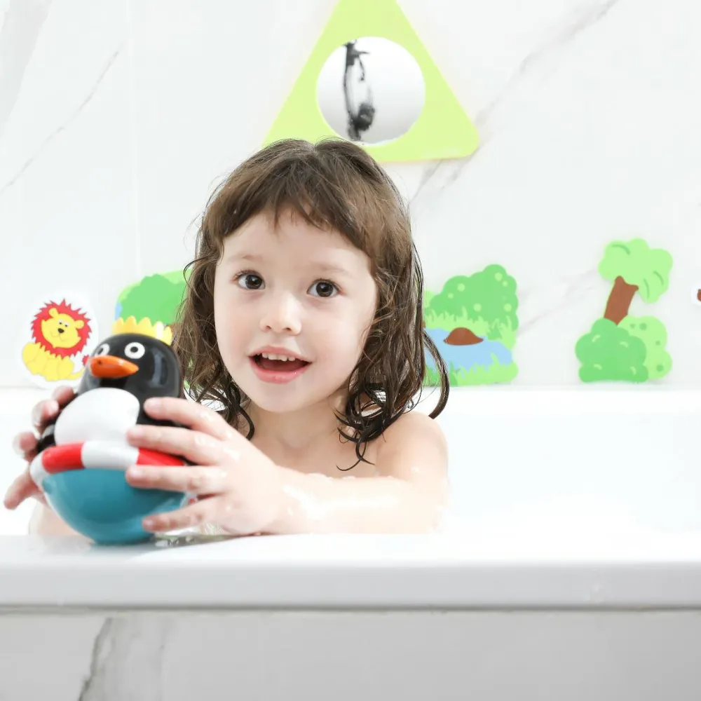 I badekarret kan dit barn fylde pingvinen med vand og se, hvordan den frækt sprøjter vandet ud af næbbet igen. Det styrker dit barns muskel-ledsans, logiske tænkning og forståelse for årsag-virkning. Måske kan pingvinen sprøjte lidt på dit barns arme, ryg eller mave. Det giver en sjov og taktil sanseleg.