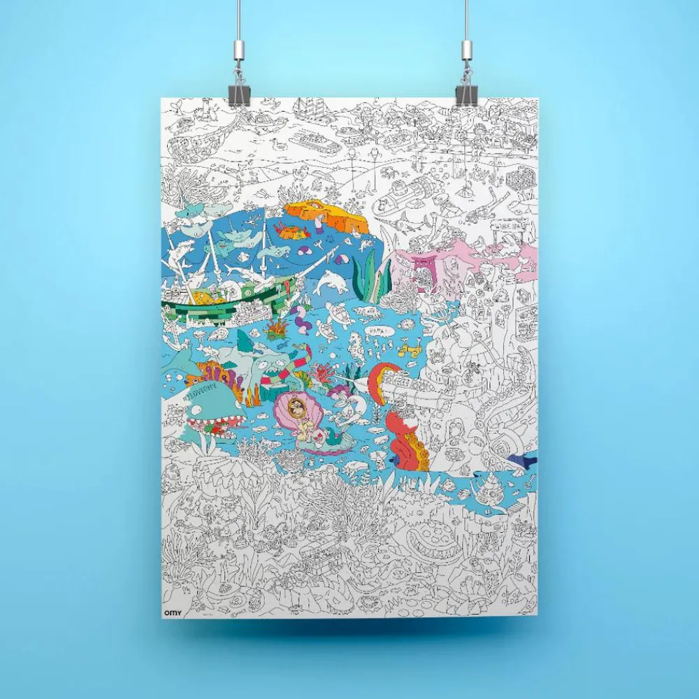 Der er virkelig mange detaljer at opdage mens I farvelægger farvelægningsplakater. Denne har havet som tema, så I kan sidde, ligge eller stå og farvelægge mens I dykker ned i de mange detaljer fra ubåd og rokker til havfruer og en glemt skat.