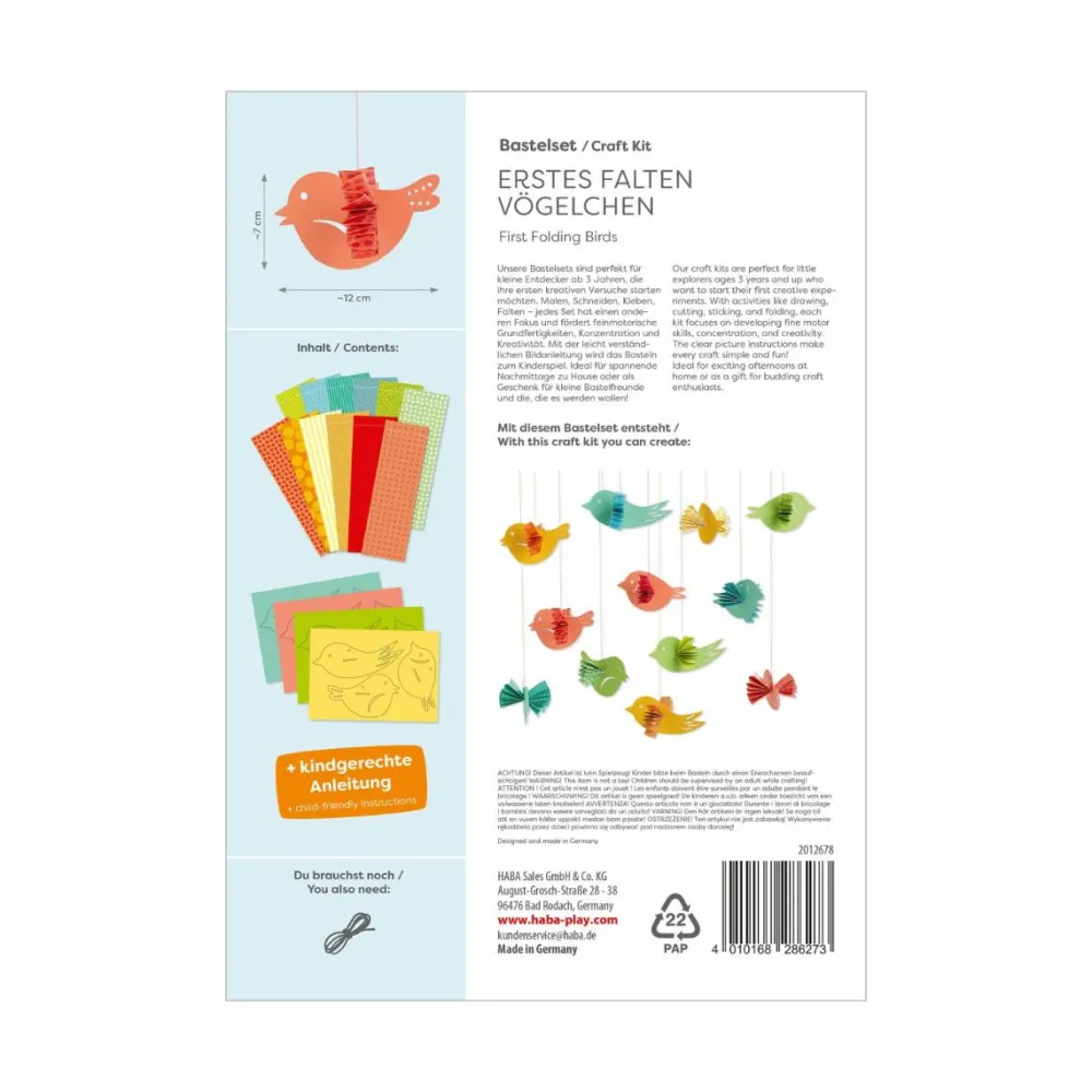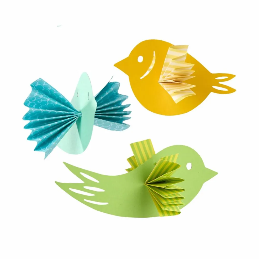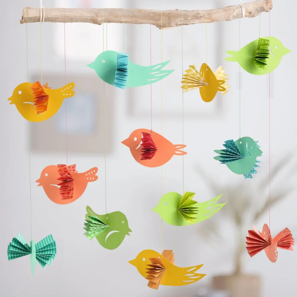 De fine ark med forskellige print skal blot foldes og puttes ind i hullerne i fuglene, og så kan I hænge hele herligheden op som en uro.