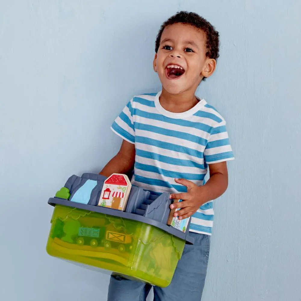 Som en smart detalje kan opbevaringsæsken til delene bruges som en del af togbanen, når dit barn har den i brug. Her bliver æsken til en grøn bakke med togbane.