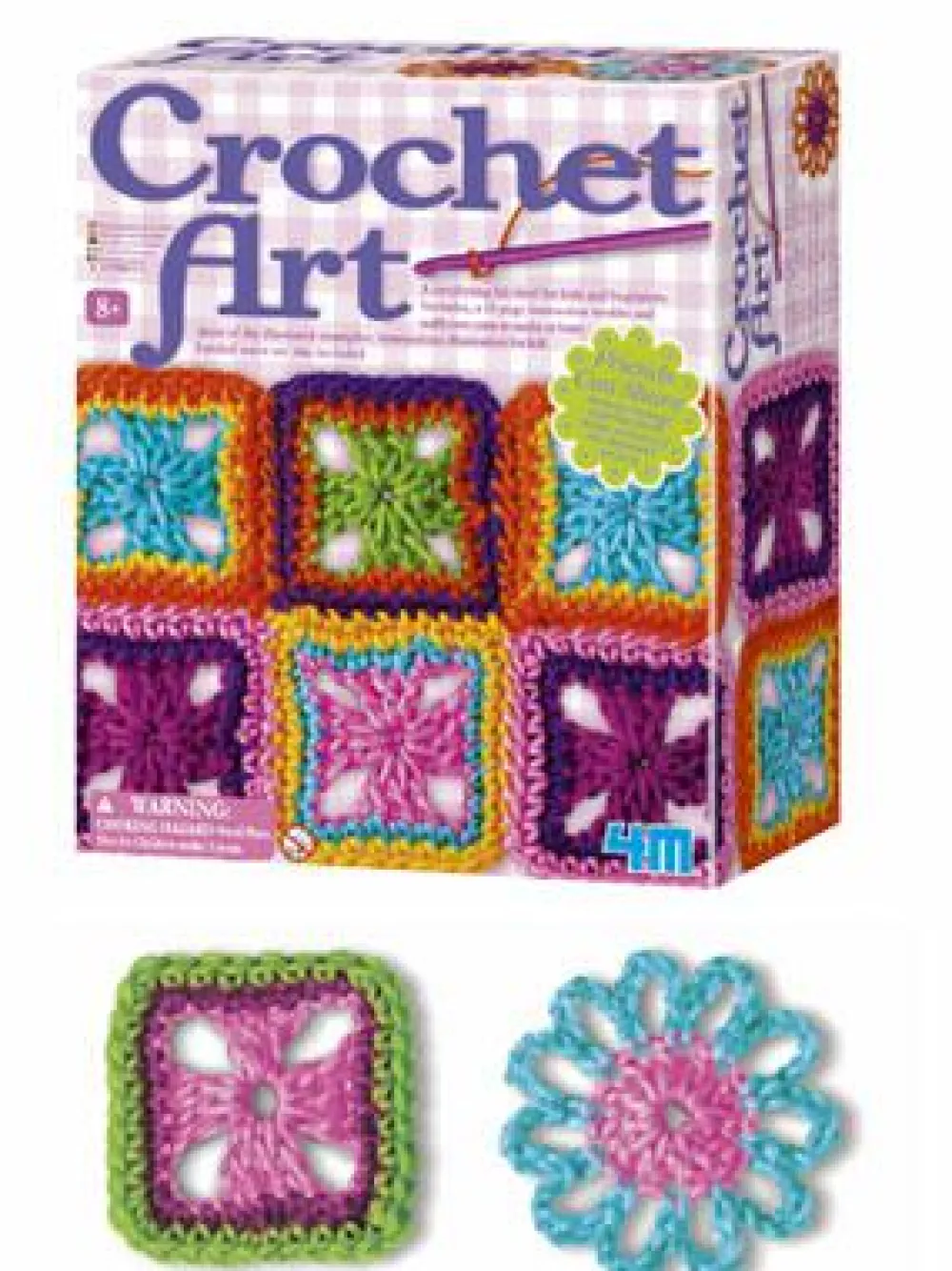 Sættet indeholder 2 hæklepinde, 1 plastiknål, garn i 7 forskellige farver og en 14 sider håndbog.