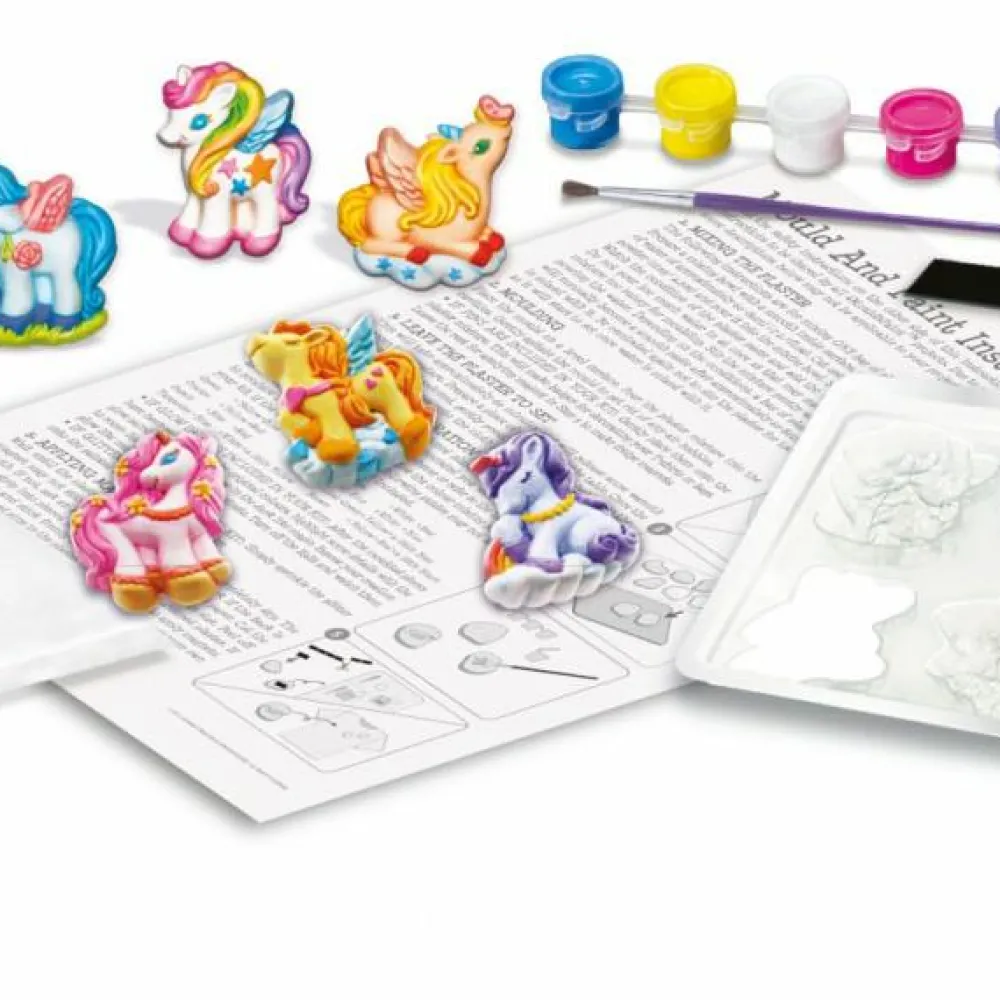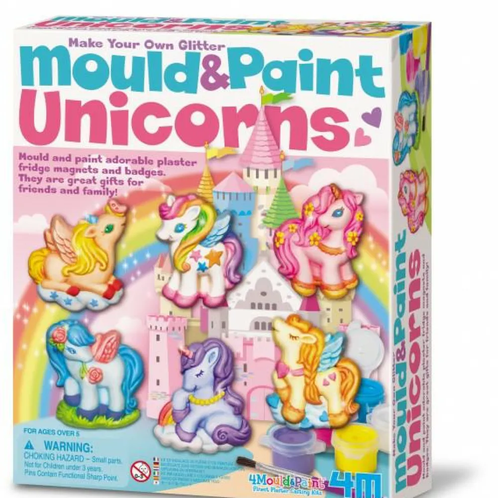 Det er spændende og lærerigt for sit barn at deltage i hele den kreative proces: først med at blande vand og gipspulver, fylde det i formene og vente på, at de tørrer. Og så starter dekorationsdelen med alle de rigtige farver til enhjørningerne og til sidst det magiske drys af glimmer.