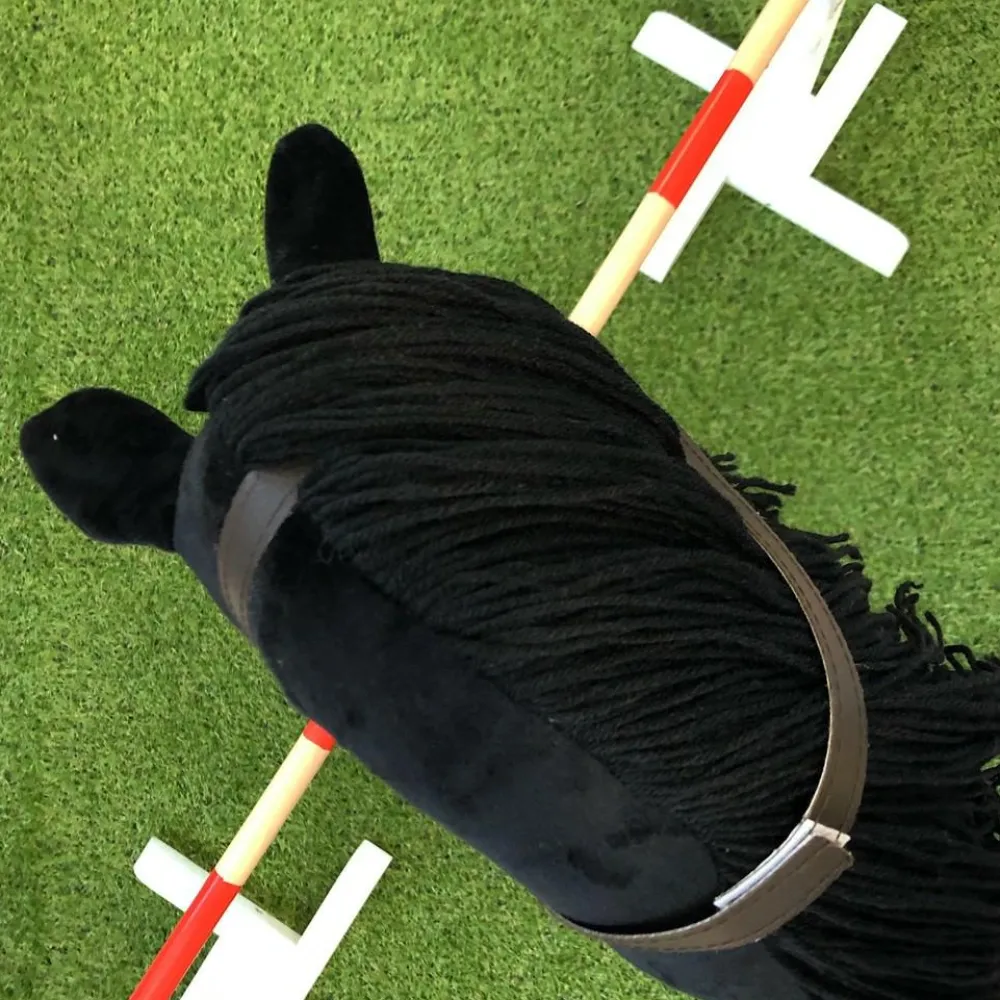 Den har nemlig fået en kortere pind på 40 cm (og ikke 62 cm som der står på fotoet af en mere langbenet udgave), så hele hesten i alt måler 68 cm og dermed ikke så nemt støder på, hvis den skal prøve kræfter med spring.