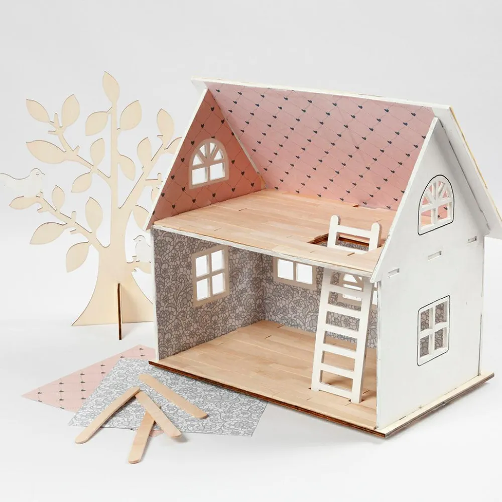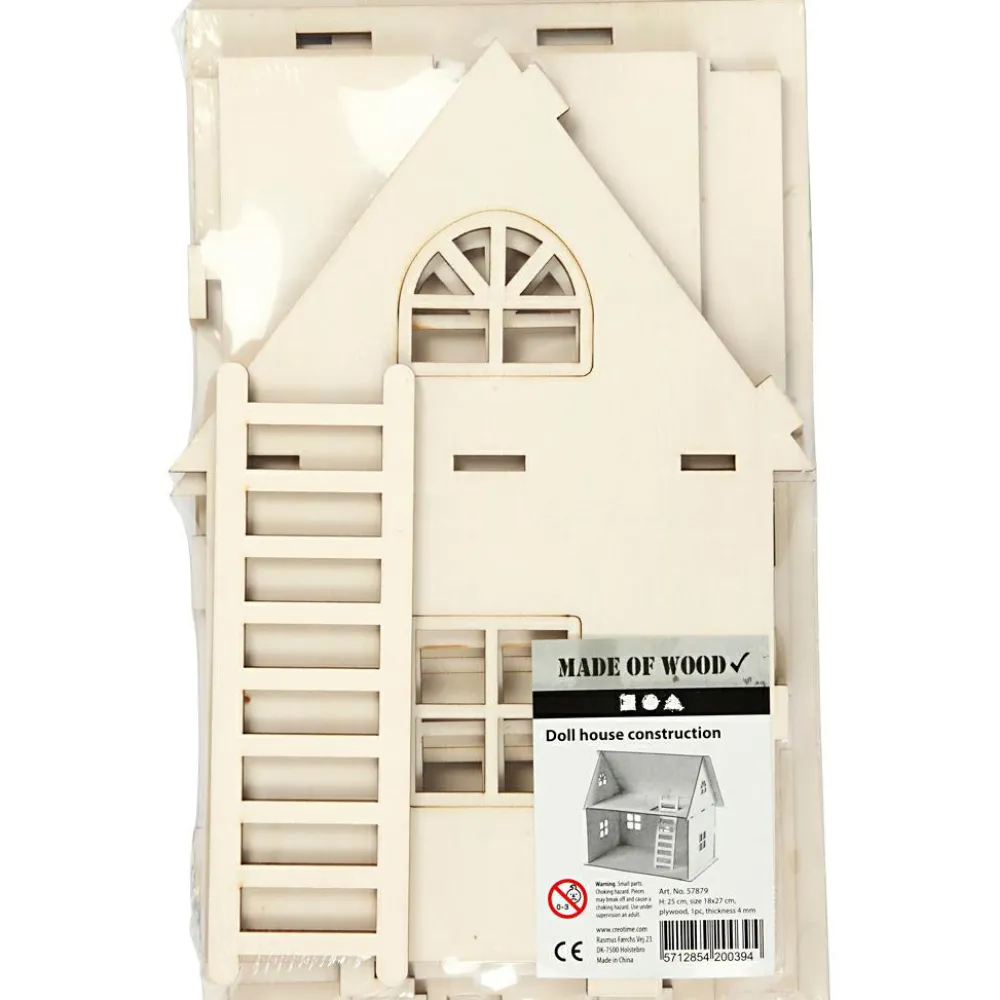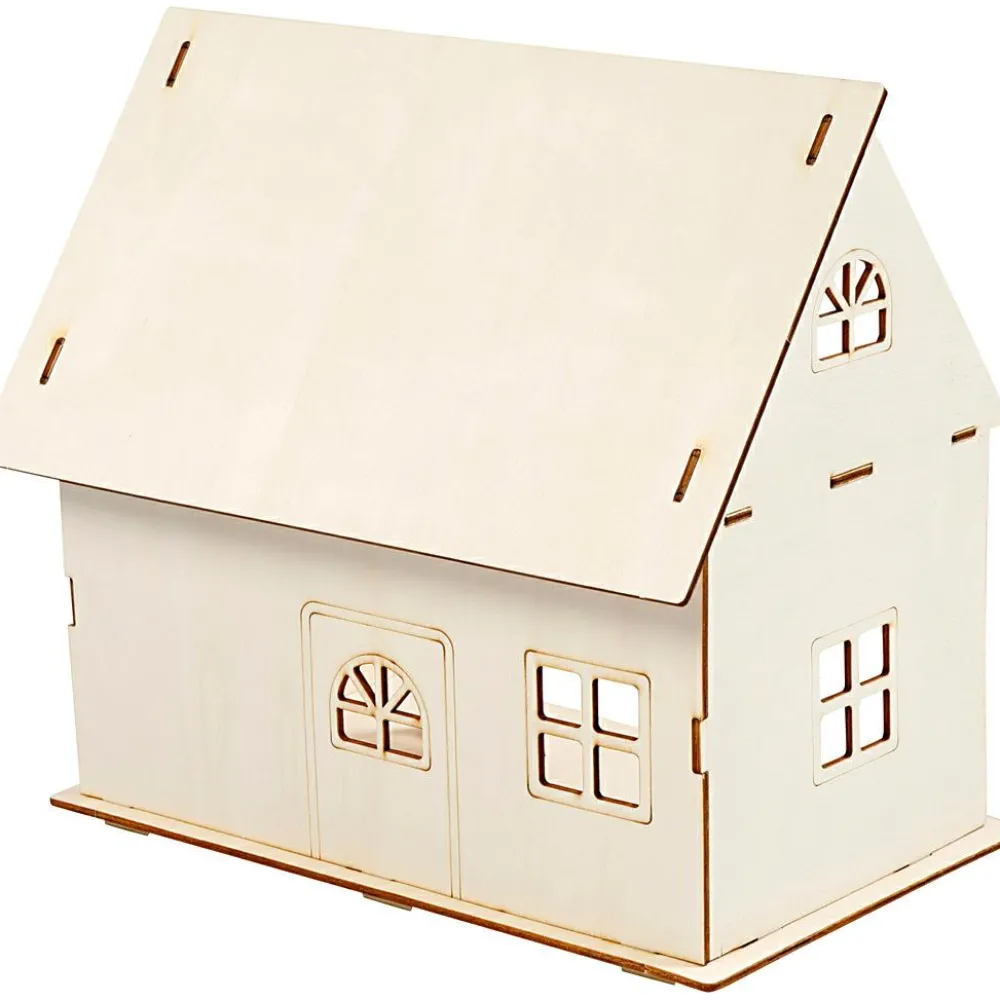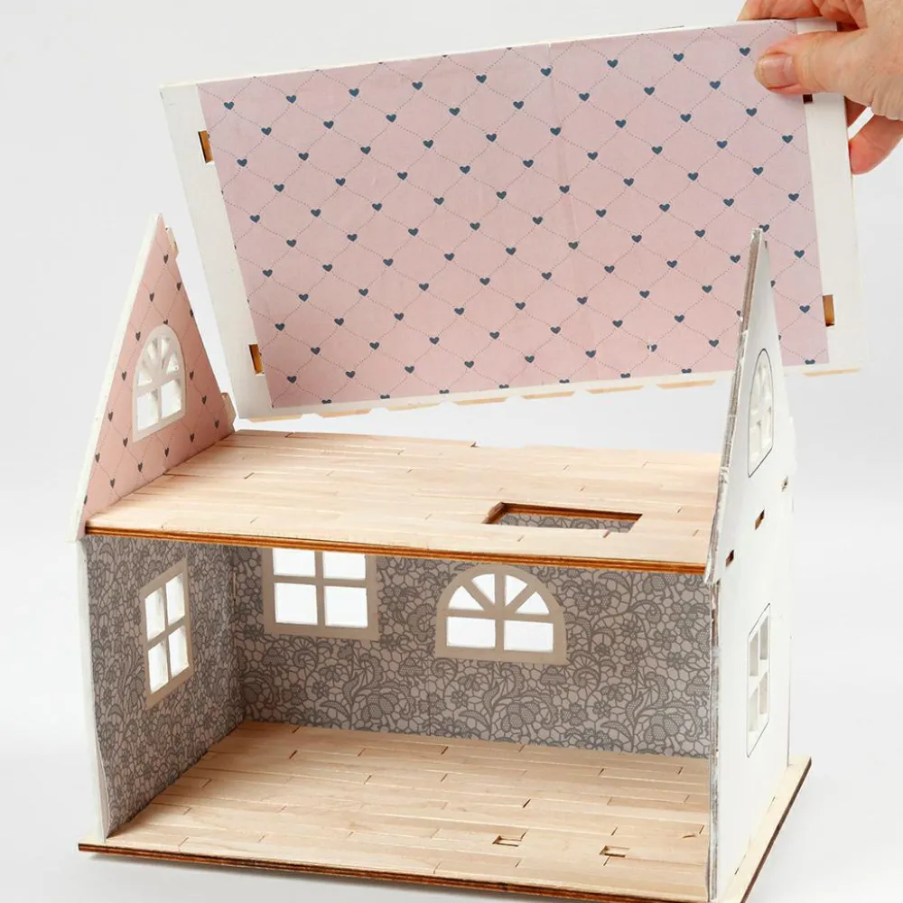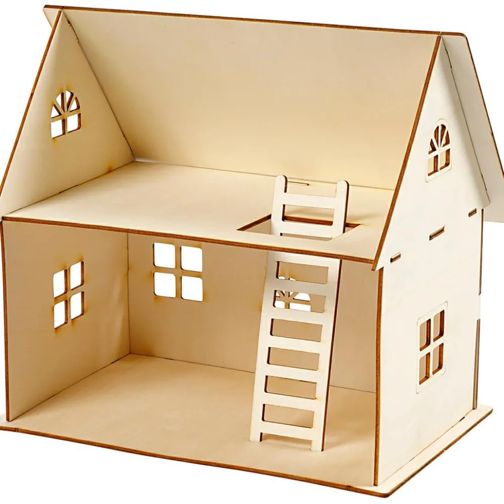Her kan du samle dit eget dukkehus. Der er konturer omkring døre og vinduer. Den ene side af huset er uden væg og tag, så kan det nemlig lettere anvendes som dukkehus.