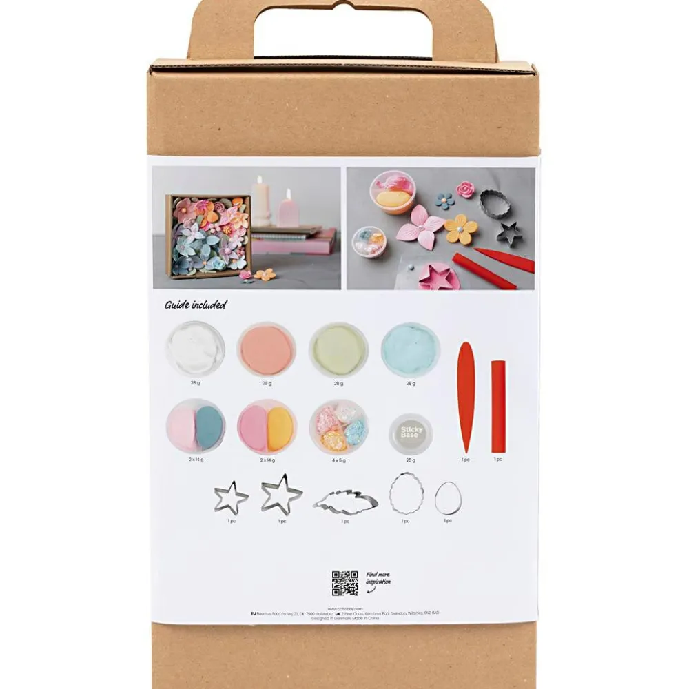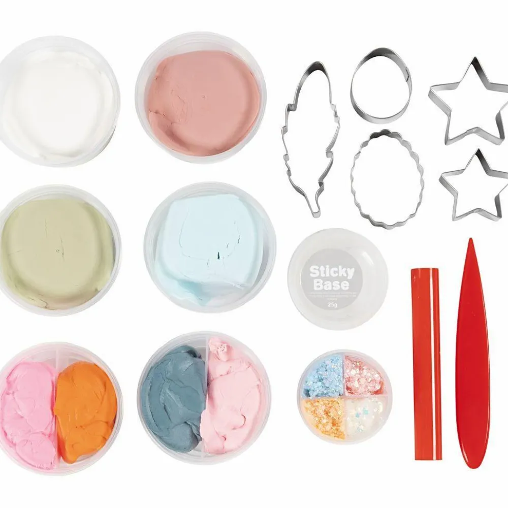 Du får også modelleringsværktøj, lim (Sticky Base) og udstiksforme, som kan genbruges til andre kreaprojekter.
