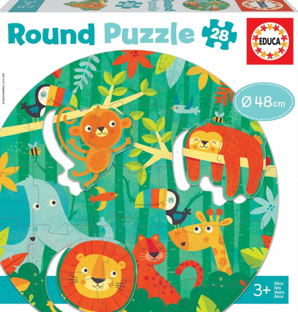 Educas puslespil viser, at både brikkerne og formen på hele puslespillet ikke behøver at have de klassiske firkantede former. Her får dit barn et rundt puslespil med store brikker i sjove former. Nogle af jungledyrene har endda brikker, der følger deres form.