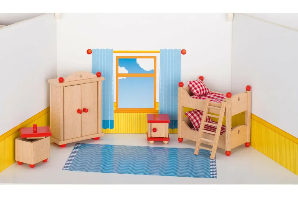 Når dit barn har fået sig et dukkehus, så skal der selvfølgelig også nogle møbler i, for at udvikle legene. I dette sæt er der møbler til at indrette et børneværelse.