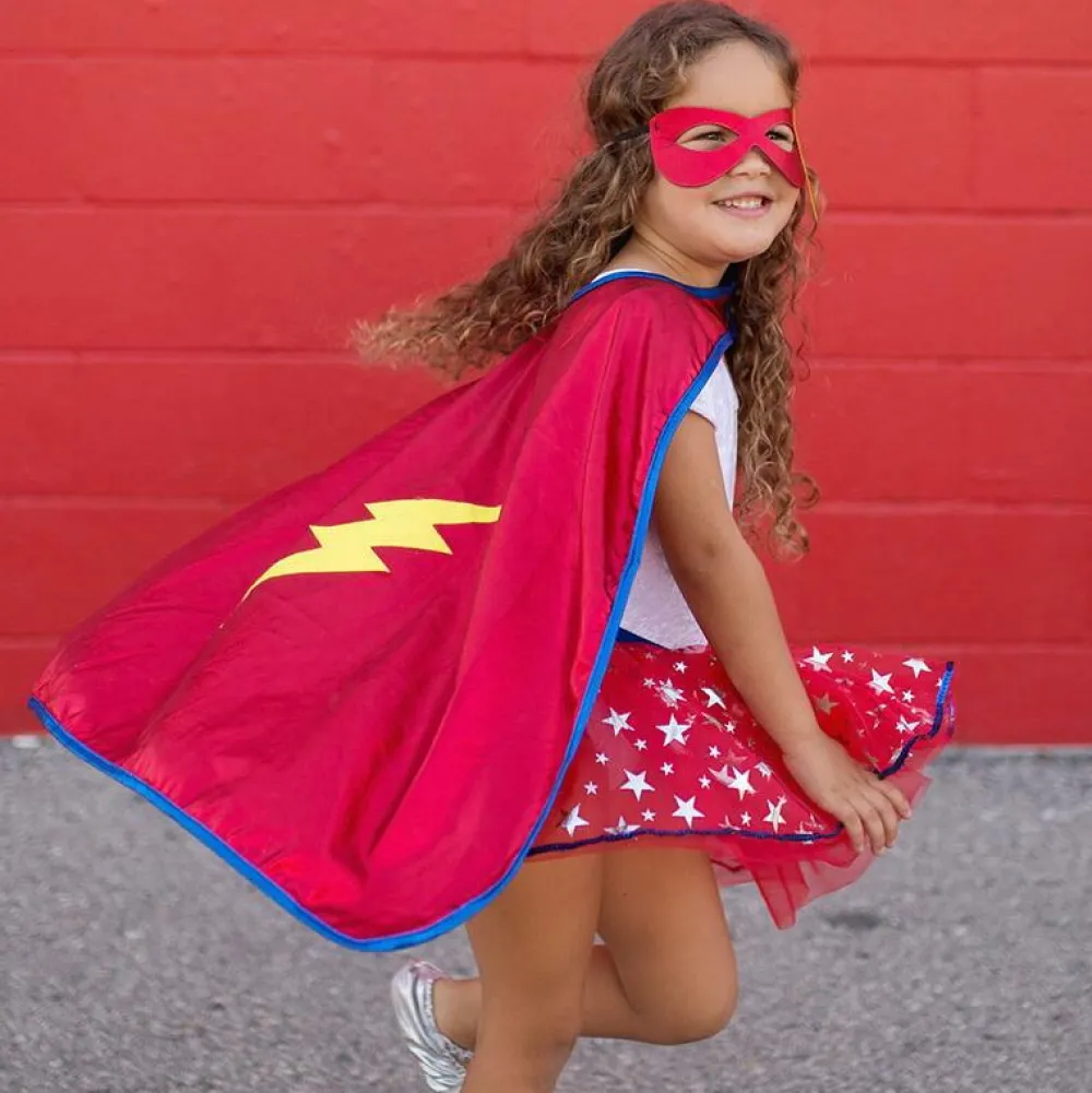 Den flotte kappe glitrer på den helt rigtige superhelte-måde, og den lukkes i halsen med velcro.