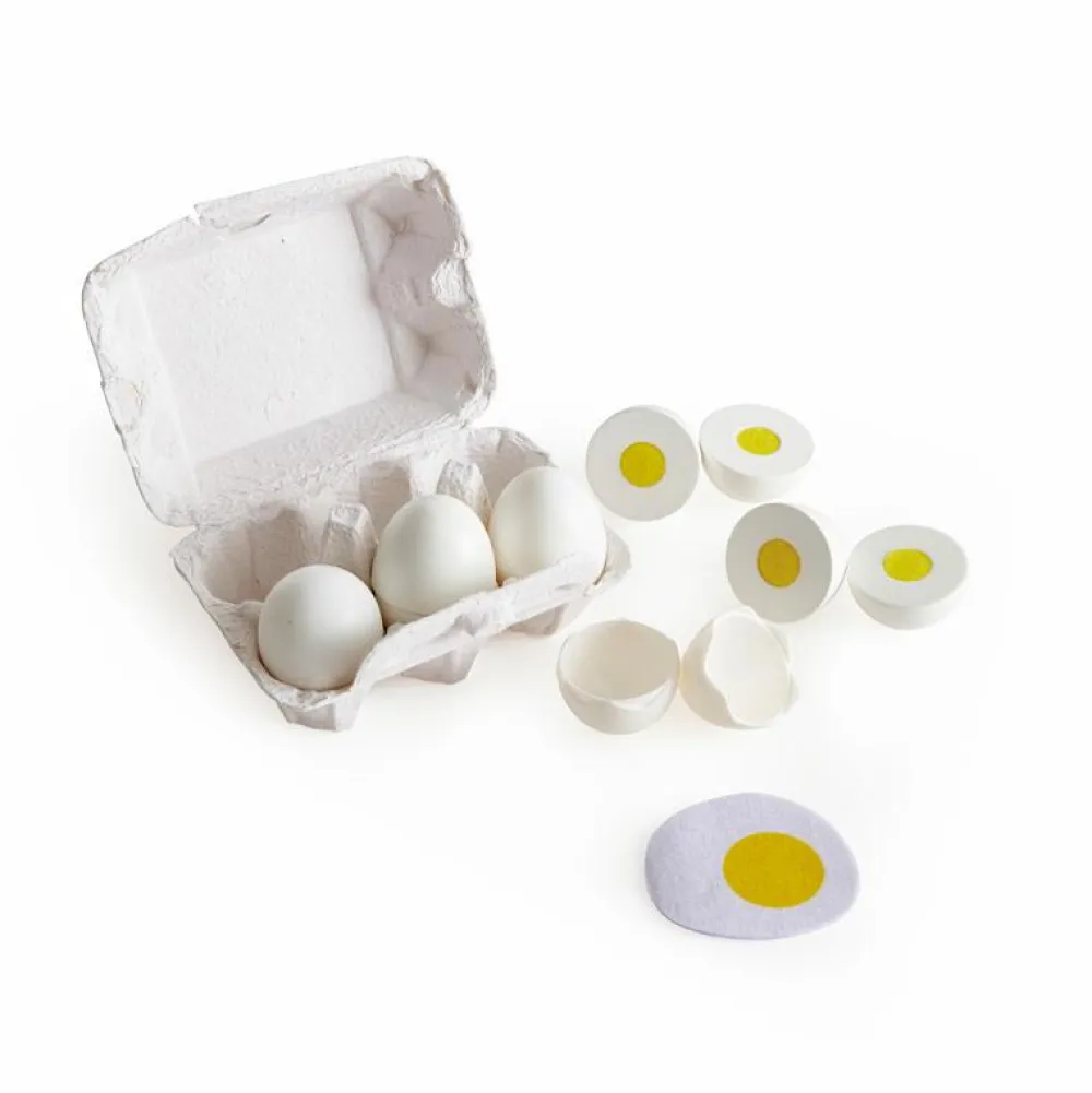 Der er 3 hårdkogte æg, som kan deles i to, og 3 spejlæg, som gemmer sig indeni æggeskallerne.
