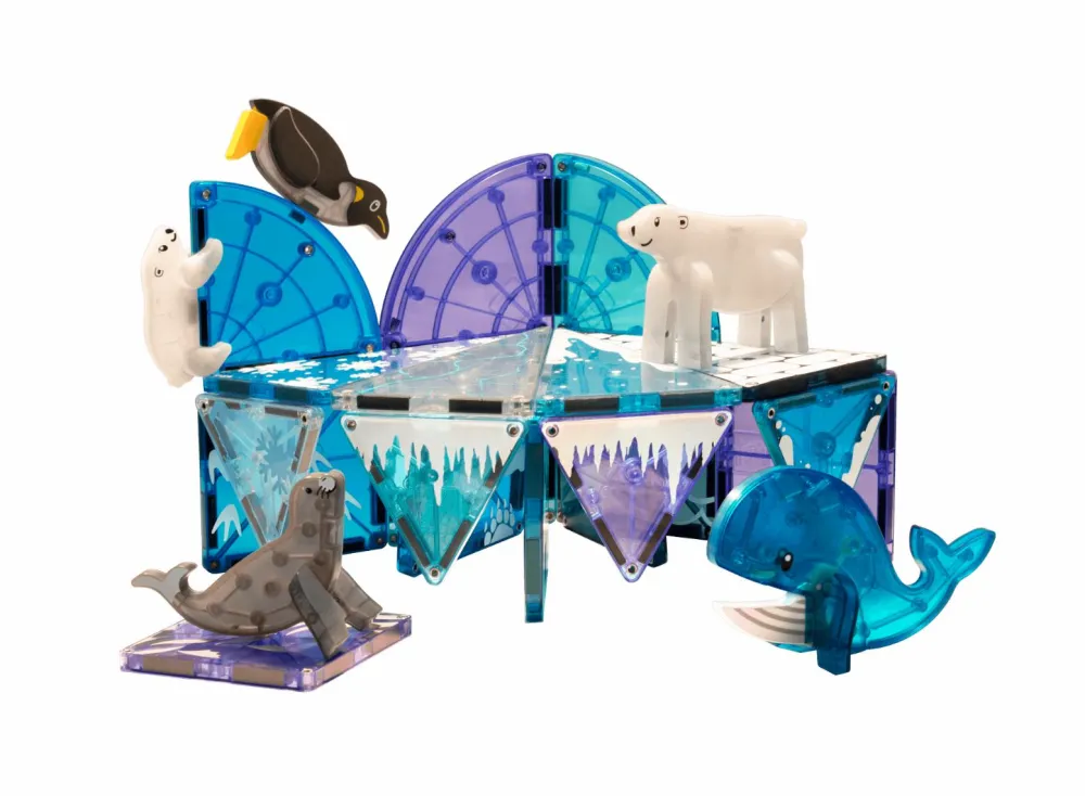 De transperante Magna-Tiles har i dette sæt fået fine prints med is, sne, dyrespor og kolde bølger. Alle brikker er magnetiske og kan sættes sammen og samles, mens I forsøger at forhindre dem i at vælte. Byggelegen udfordrer både børns og voksnes rumlige intelligens og motorik.
