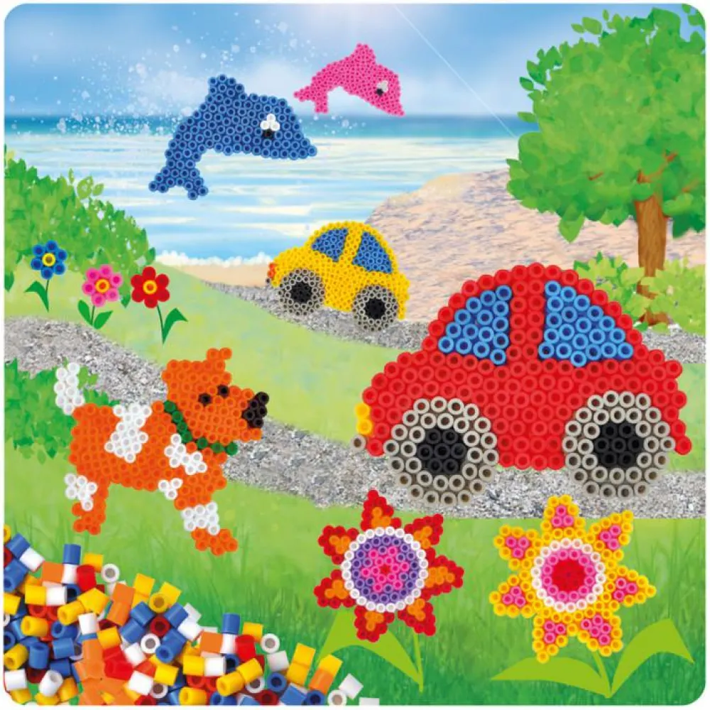 Perlepladerne er med en hund, en bil, fisk og blomst. De er gennemsigtige, så I nemt kan lægge skabeloner under.