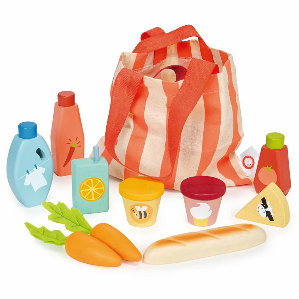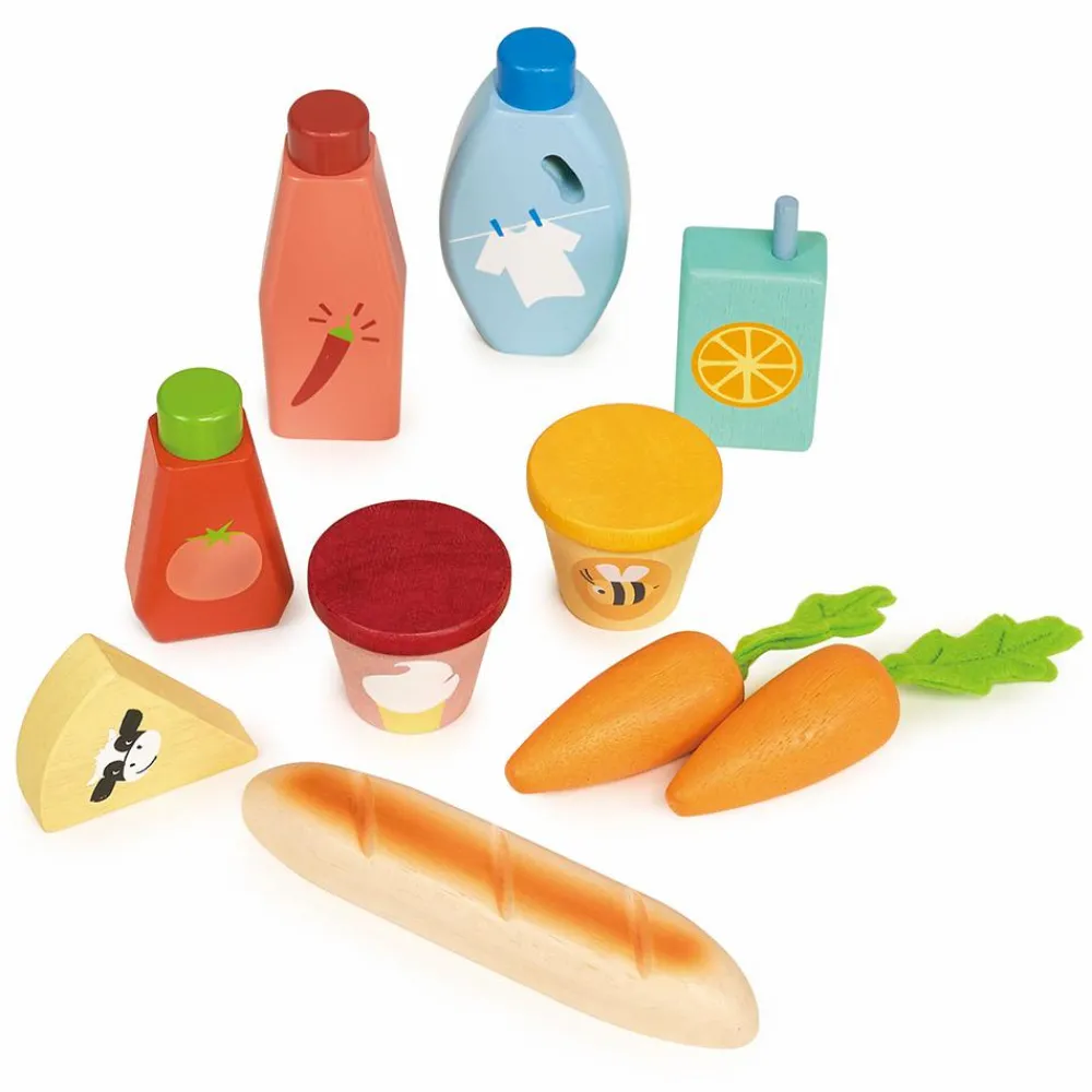 Gå på indkøb og kom hjem med muleposen fuld af is, honning i krukke, juice, ost, chilisause, opvaskemiddel gulerødder og baguette.
