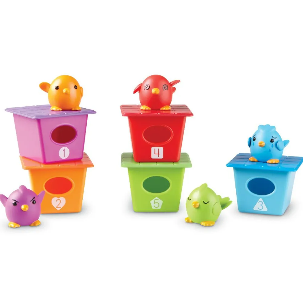 I hver af de 5 huse bor der en lille fugl i samme farve. Hver fugl har sit eget mere eller mindre tossede udtryk, som dit barn vil nyde at gengive i legen med at hjælpe fuglene ind i de små huse.