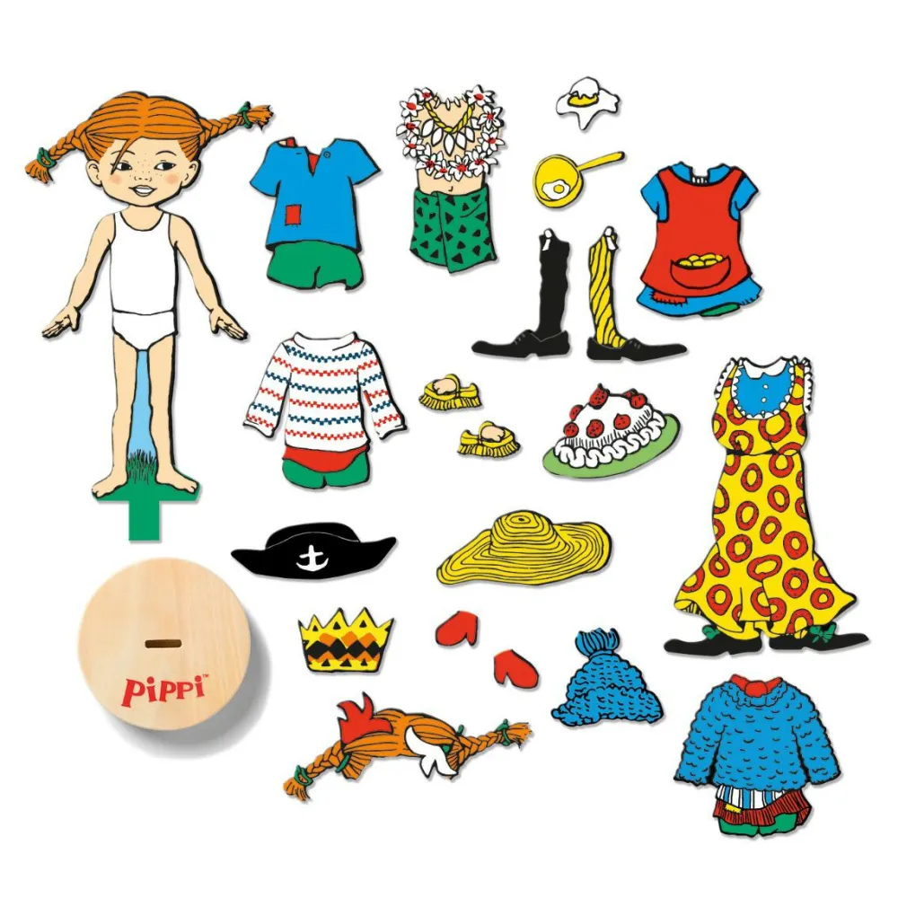 Her er 20 magnetiske dele, så Pippi kan blive klædt på og har lidt at vælge imellem alt efter dagens humør og gøremål.