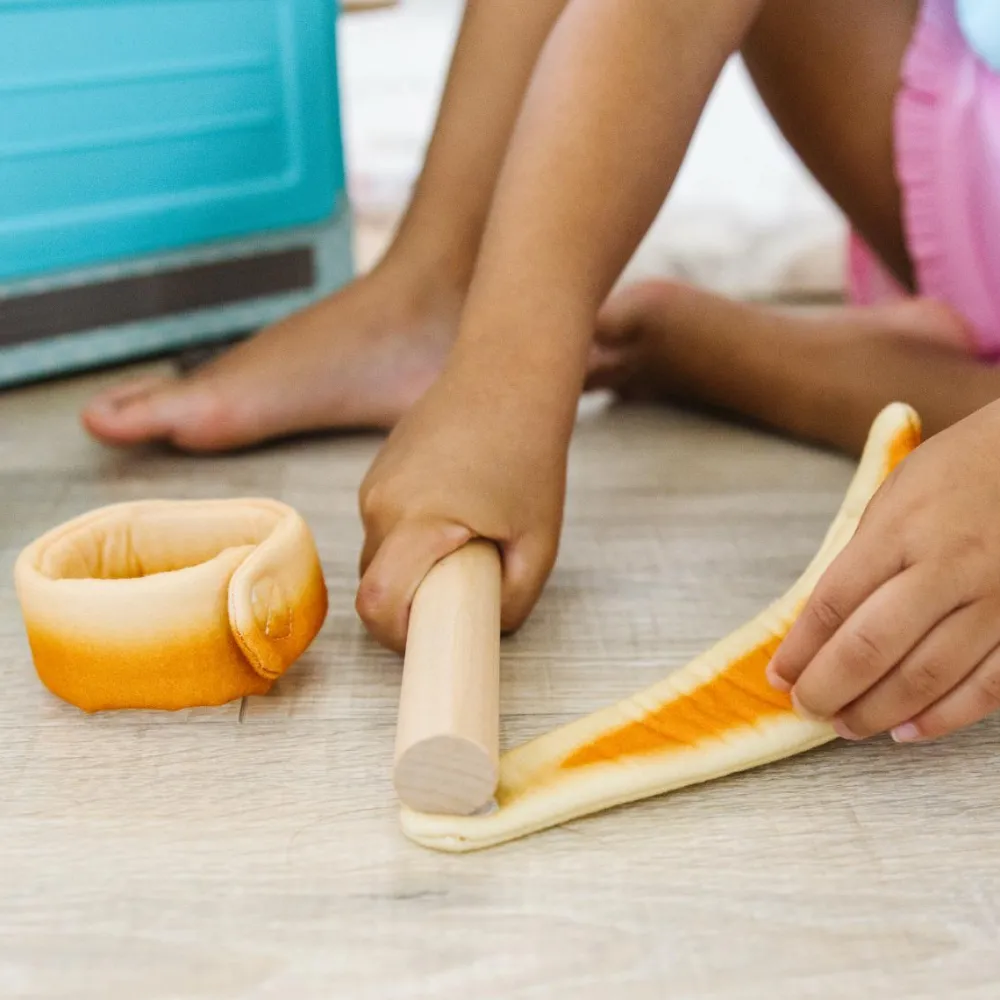 Legemad er sjovt til rolleleg, hvor dit barn spejler situationer fra indkøb, madlavningen eller hvis I har været på cafetur. Tal om hvor maden kommer fra og hvor den forsvinder hen inde i kroppen. Det udvikler dit barns viden og ordforråd.