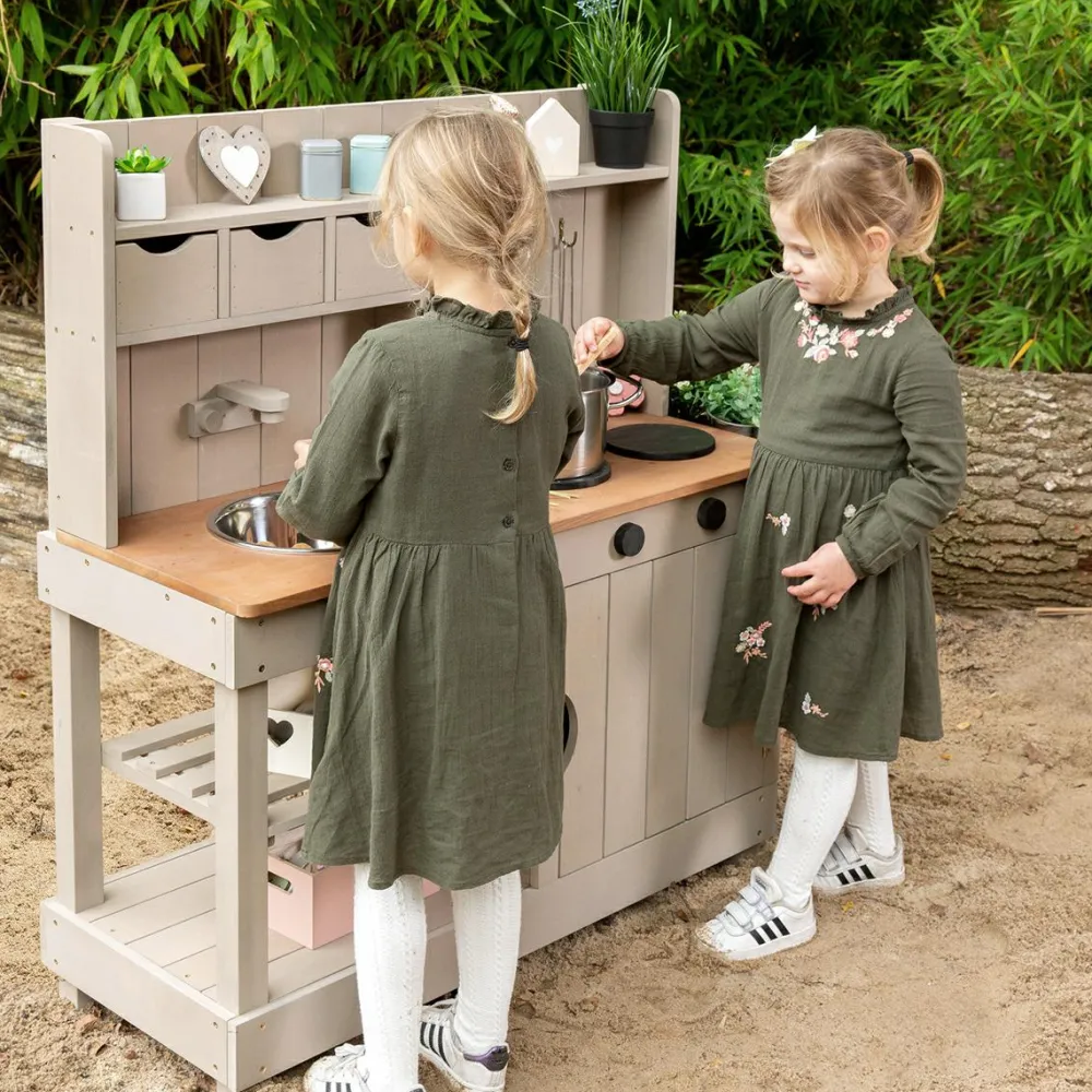 Det skønneste udelegskøkken med et væld af muligheder for at fremstille sneglesuppe, pløregullash, mælkebøttecookies og smoothies med kompostorm og grusdrys.