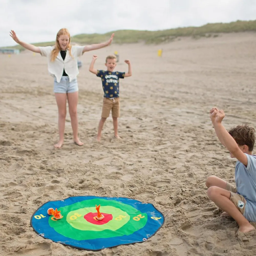 Spænd skydeskiven ud på stranden eller til leg i haven og øv jer i at kaste og ramme i midten, mens I tæller point og holder styr på, hvem der fører.