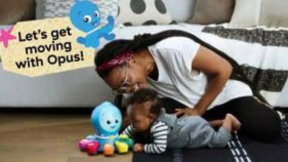 Når dit barn ligger på maven og øver sig i at løfte og styre hovedet, vil en berøring af en af de bløde blækspruttearme få sprutten til at dreje rundt, lyse og synge.