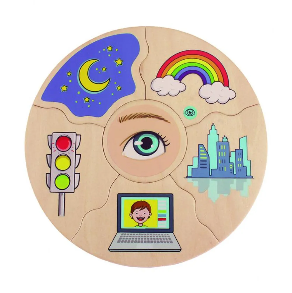 Høre, røre, se, lugte og smage. Lær om de fem sensoriske sanser med disse fem puslespil i træ, som viser en sans hver.