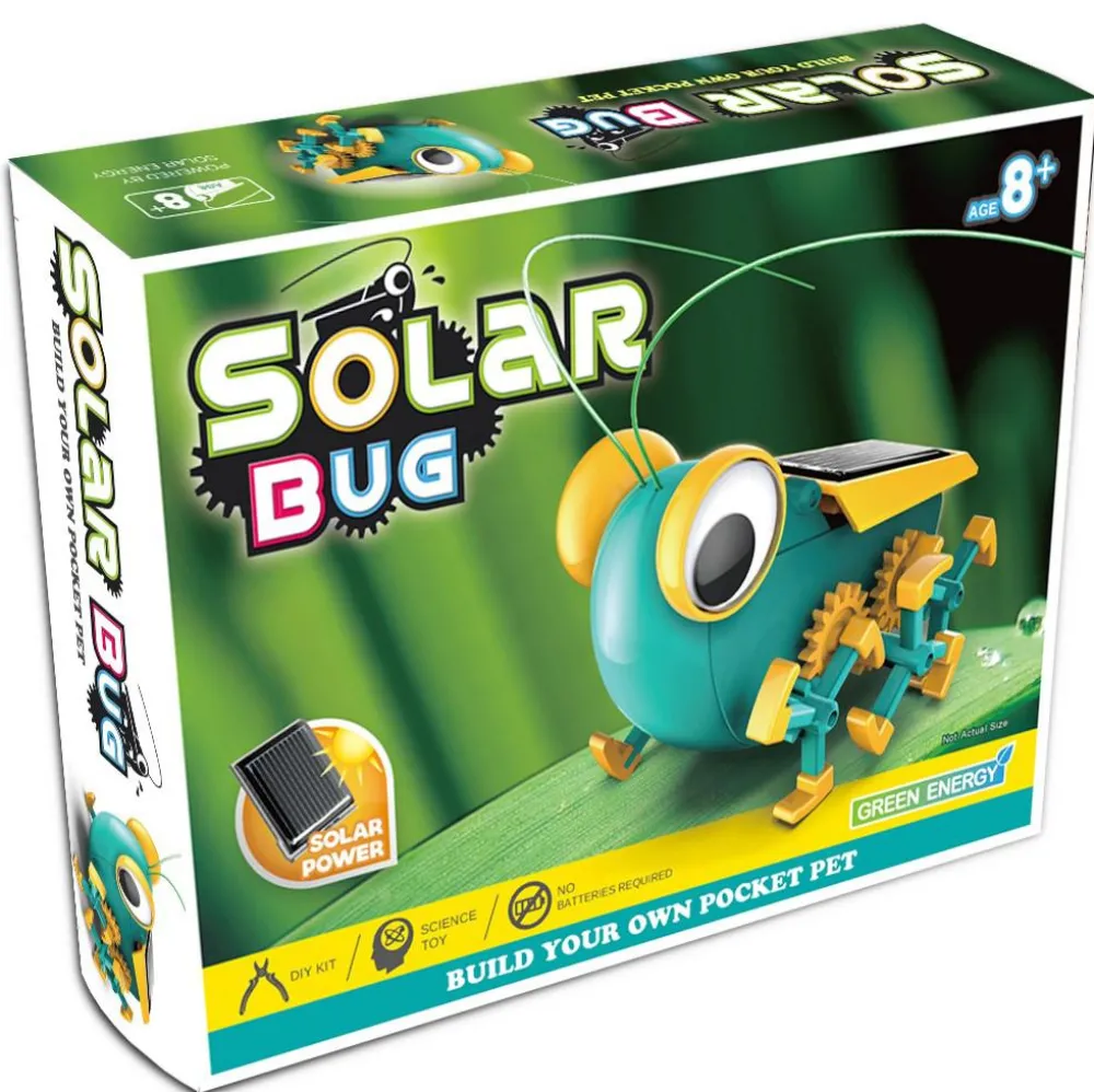 Byggeinstruktionen er på engelsk, og det er en 3-i-1 opgave at samle insektet, hvor dit barn både øver sig på engelsk, på at løse problemer og på at undersøge solkraft.