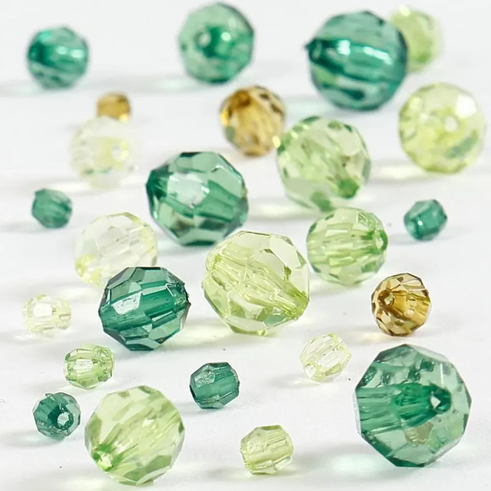 Perlerne er i grønne nuancer, fremstilket i klar akryl og facetslebne. Blandingen indeholder 5 forskellige størrelser.