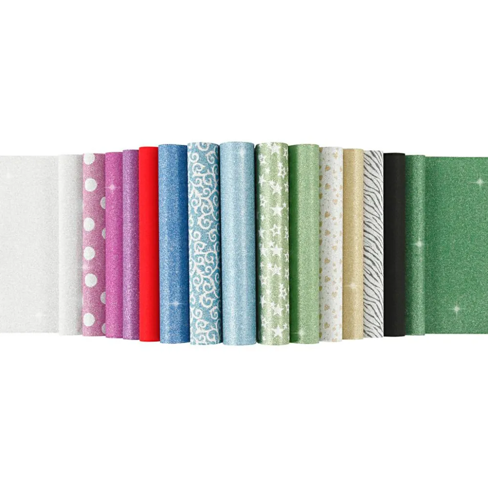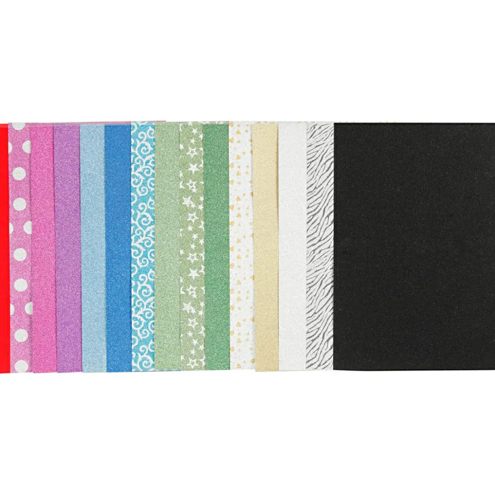 I pakken er der 30 ark af mat papir trykt med glitterlak på den ene side. Der er i alt 10 ensfarvede og 5 mønstrede ark a 2 stk.