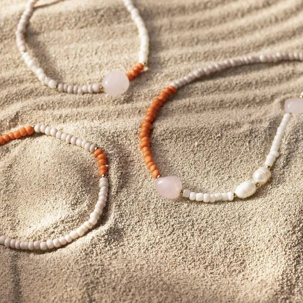 Indhold: Rosakvarts, rocaiperler, karabinhager, klemmeperler, knudskjulere, o-ringe, smykkenål, smykketråd, ferskvandsperler, elastiksnor.