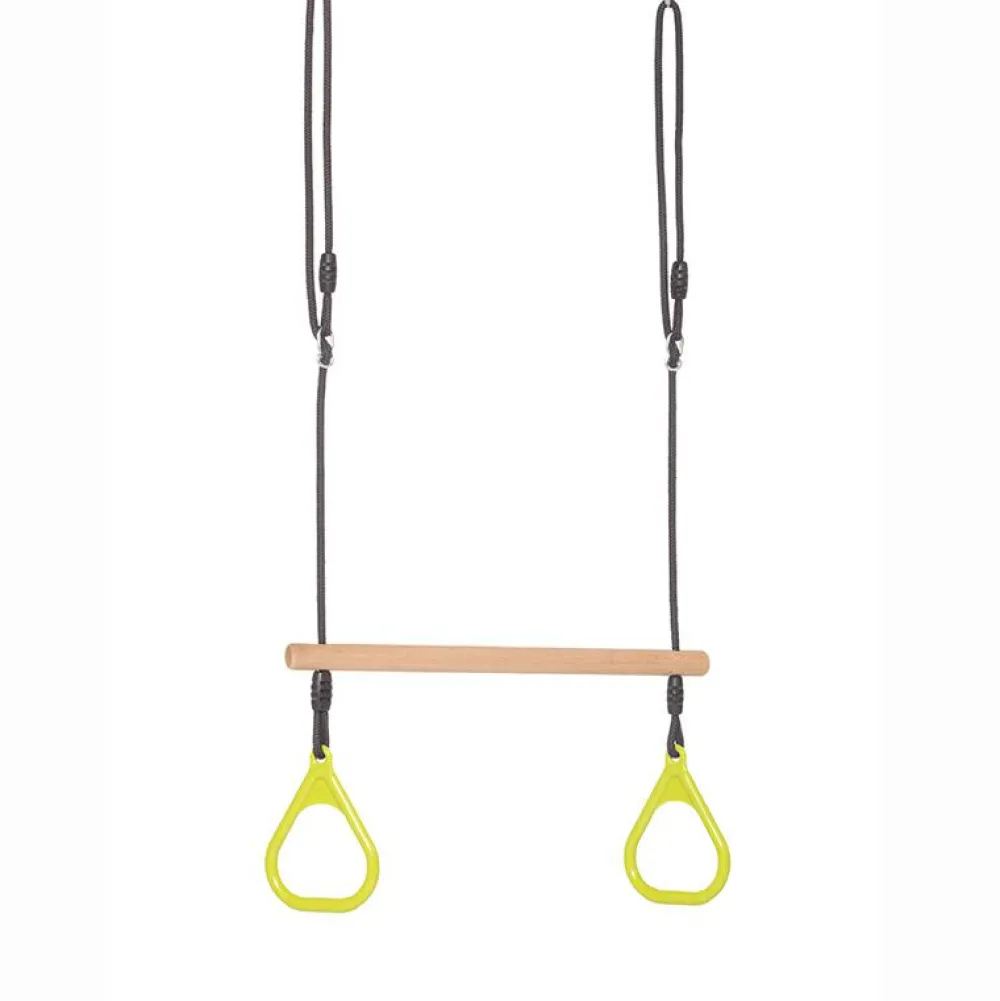 Denne trapez kombinerer en klassisk trapez af træ med plastringe, så dit barn kan svinge, hænge og lege på flere måder. Rebene kan justeres i højden, så trapezen passer til gyngestativer op til 250 cm.