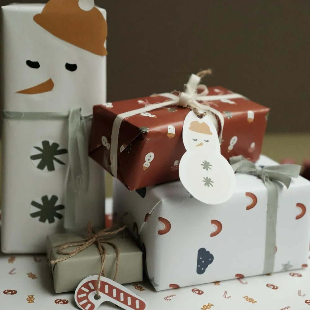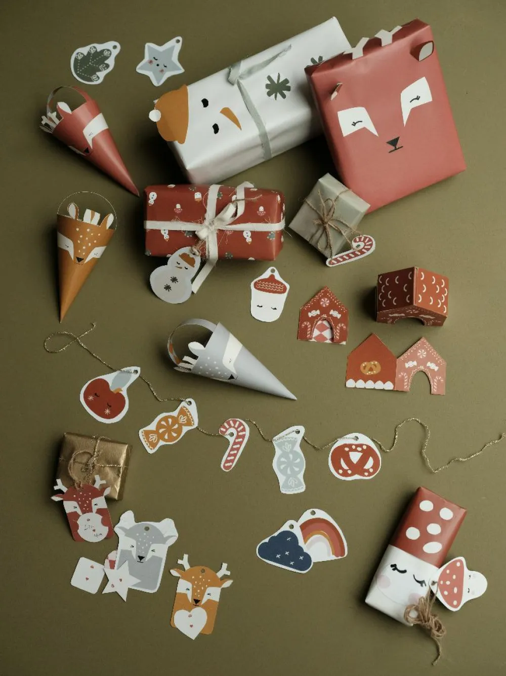 Hæftet har A4 størrelse og indeholder til-og-fra-kort, kræmmerhuse og fine dyre- og snemandsdetaljer, som I kan pynte julegaverne med.