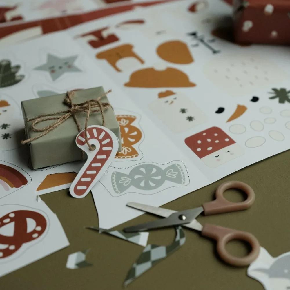 Og klip julekarameller, små snemænd og stjerner og julekringler ud af det tykke papir og brug dem til ophæng, til pynt på gaverne eller på en fin guirlande. Legen kræver god finmotorik og styr på saksens bevægelser.