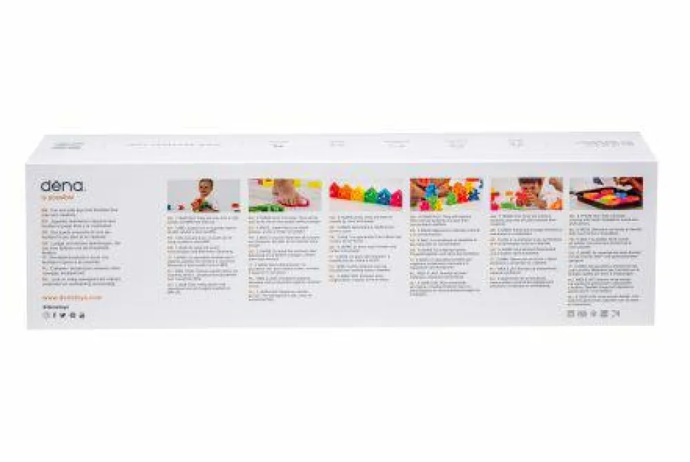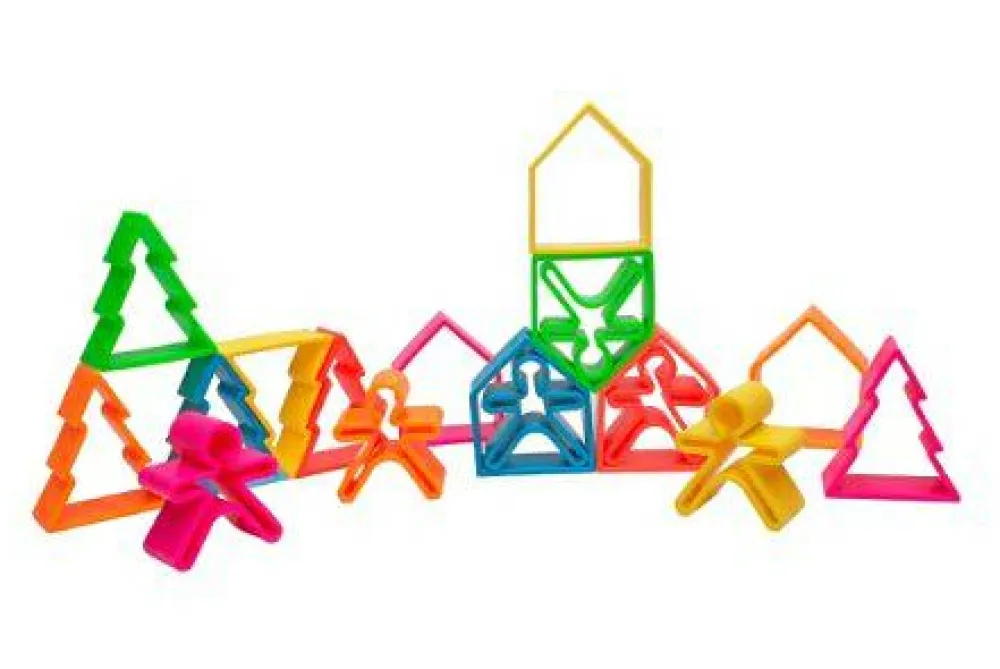 I pakken er der 18 forme. 6 huse, 6 personer og 6 træer i 6 forskellige farver.