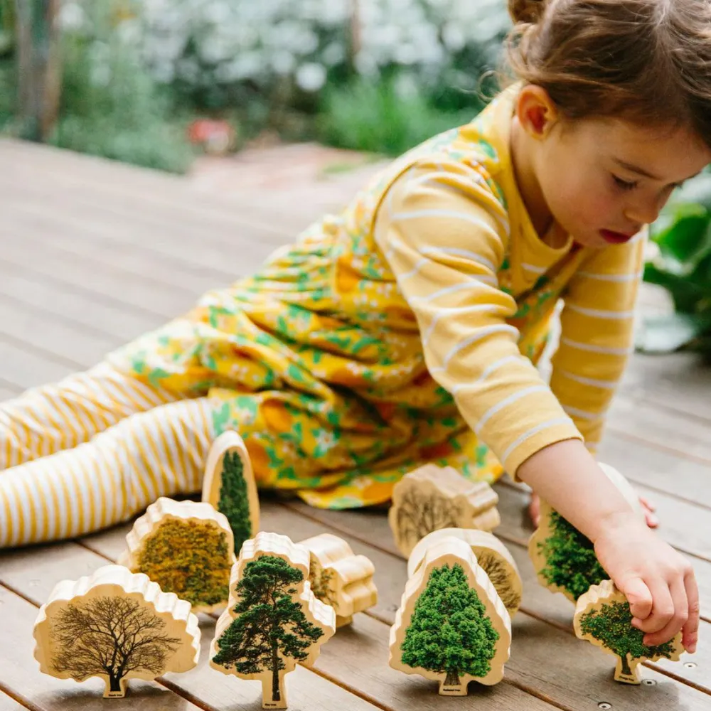 Lad dit barn sortere træerne efter deres højde, efter hvilken tid på året, de repræsenterer, eller efter kronens størrelse. Brug træerne til at skabe liv omkring en bilbane. Brug dem som bordpynt, når I har gæster. Saml en skov, som små figurer kan tage på tur eller forsvinde ind i.