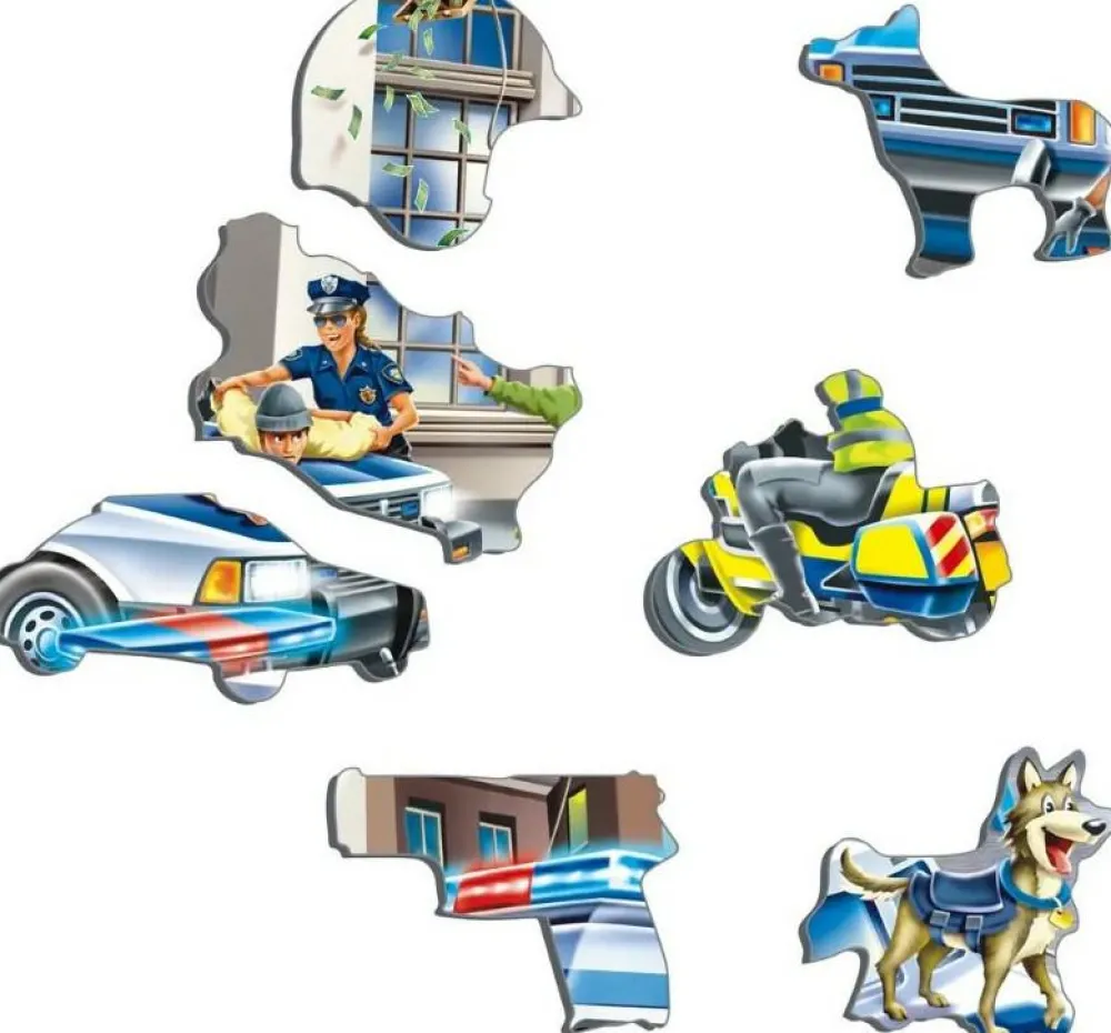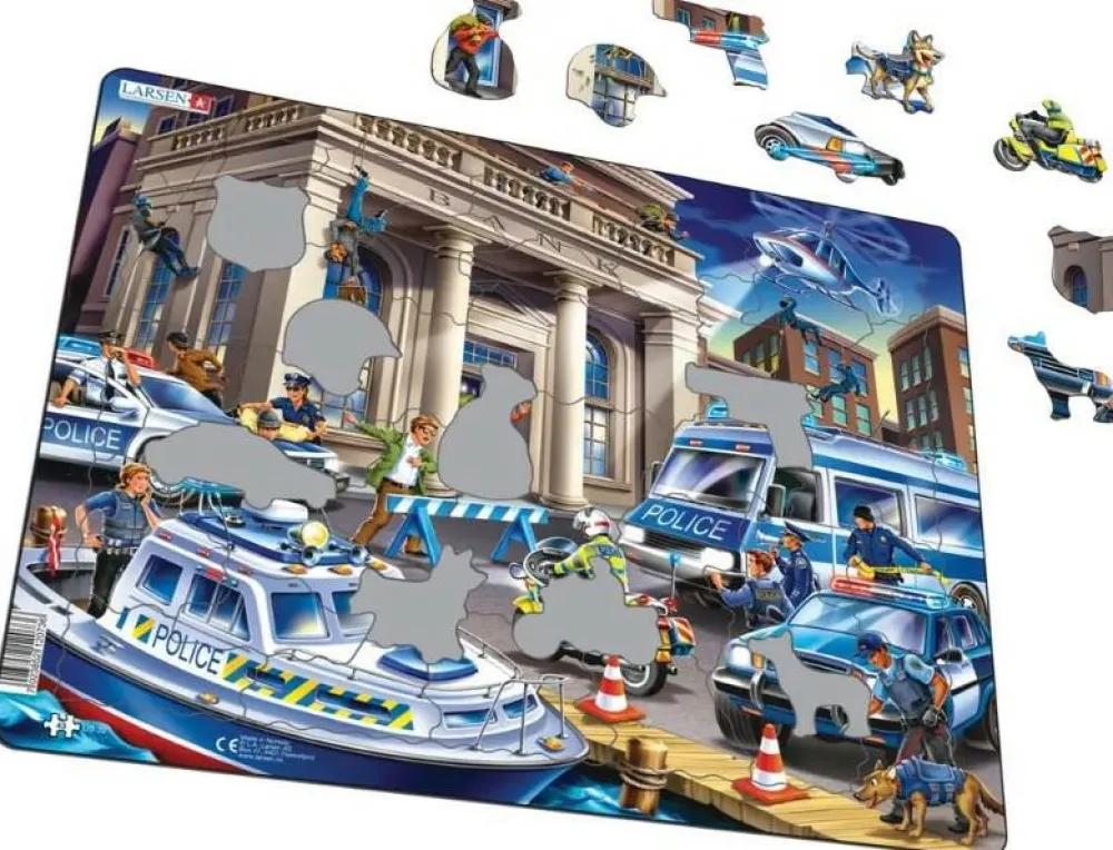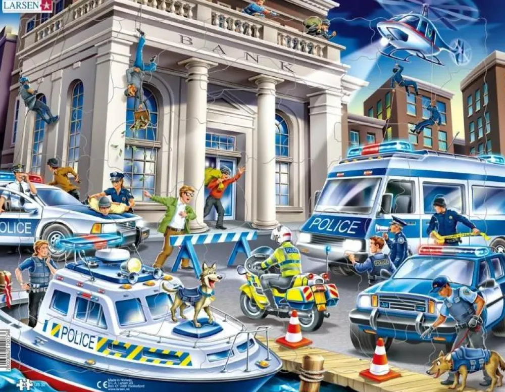 Kom med til en spændende politiaktion i dette puslespil og fang bankrøverne, før de stikker af. Politihelikopteren og motorcyklen er klar, og det er sporhunden også. Der er ægte politi-action her, når de kriminelle bøller skal fanges og ligges i håndjern. Illustrationen giver anledning til mange gode snakke og historier.
